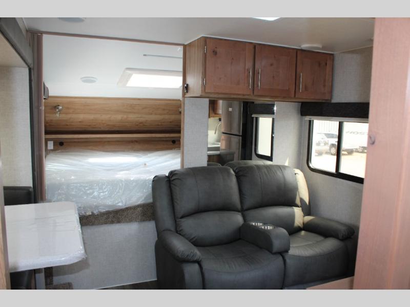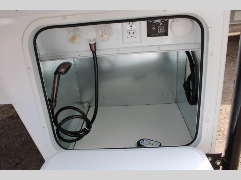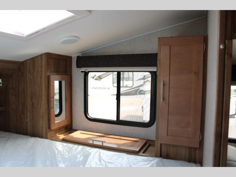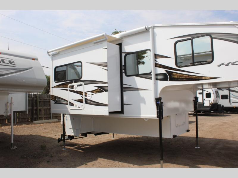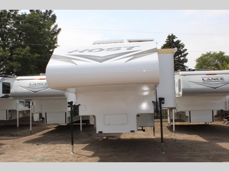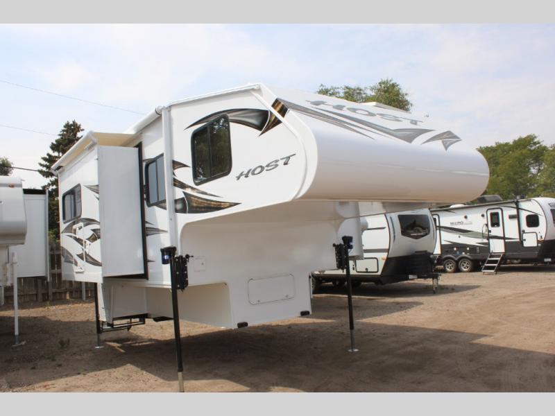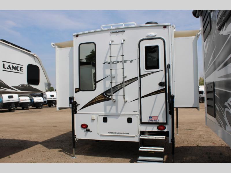 With any Host Industries Host Campers truck camper, there is ease of setting up with electric jacks with a wireless remote, and security when traveling thanks to the heavy duty camper tie down brackets. Each is constructed with two or three slide outs giving you more interior space on an Ultralite 100% aluminum structure with vacuum bonded foam insulated walls, a floor and a ceiling, plus there is a one-piece TPO roof. Some conveniences include an enclosed service center, enclosed and heated holding tanks, large J-rail rain gutters, and access panels for the slide out motors, water tank and holding tanks to mention a few. And the interior is just as impressive from the style, decor choices, the 12 volt LED lighting system, the Grani-coat solid surface countertops, and the many options you can add to customize your Host Camper!