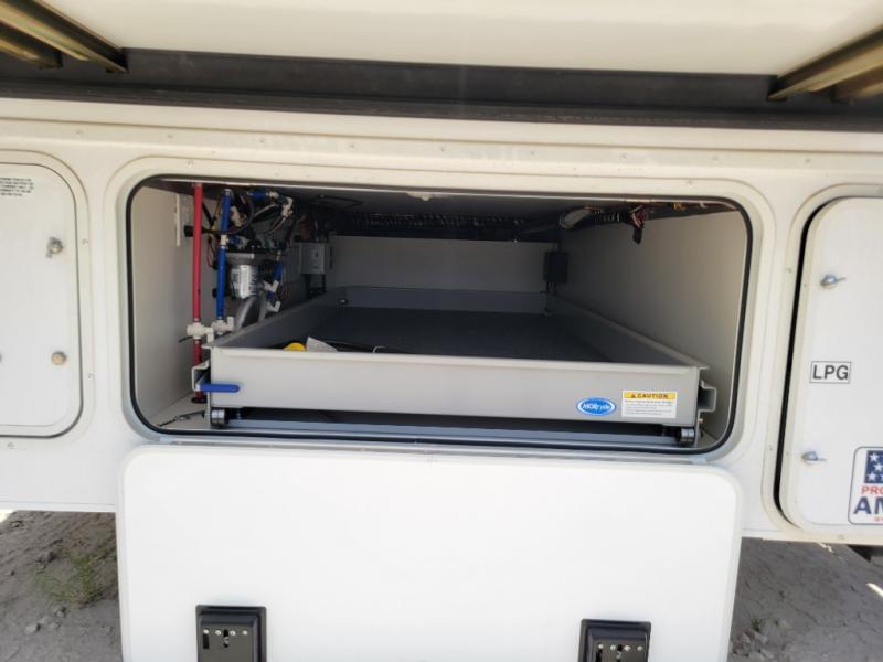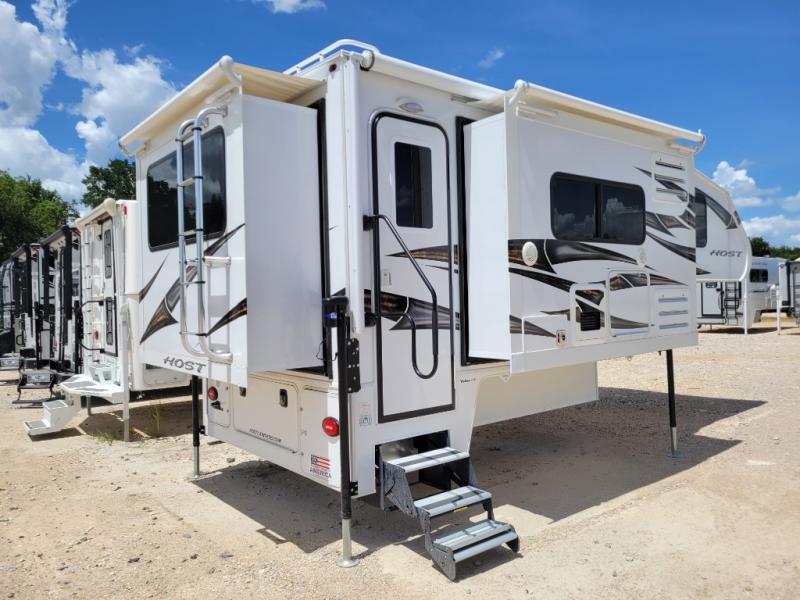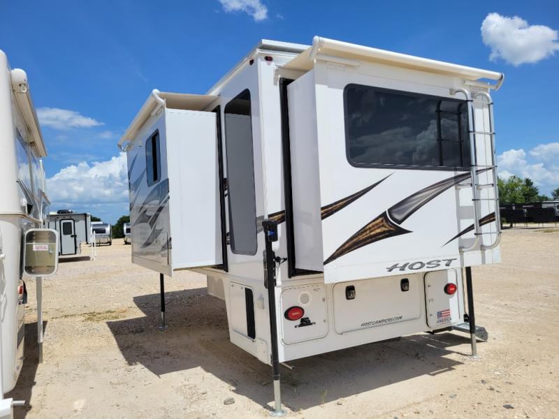 With any Host Industries Host Campers truck camper, there is ease of setting up with electric jacks with a wireless remote, and security when traveling thanks to the heavy duty camper tie down brackets. Each is constructed with two or three slide outs giving you more interior space on an Ultralite 100% aluminum structure with vacuum bonded foam insulated walls, a floor and a ceiling, plus there is a one-piece TPO roof. Some conveniences include an enclosed service center, enclosed and heated holding tanks, large J-rail rain gutters, and access panels for the slide out motors, water tank and holding tanks to mention a few. And the interior is just as impressive from the style, decor choices, the 12 volt LED lighting system, the Grani-coat solid surface countertops, and the many options you can add to customize your Host Camper!