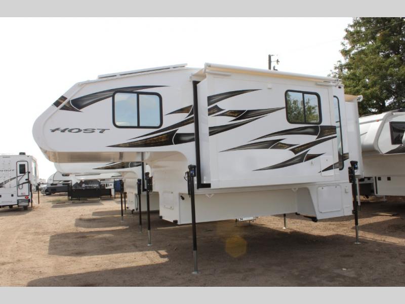 With any Host Industries Host Campers truck camper, there is ease of setting up with electric jacks with a wireless remote, and security when traveling thanks to the heavy duty camper tie down brackets. Each is constructed with two or three slide outs giving you more interior space on an Ultralite 100% aluminum structure with vacuum bonded foam insulated walls, a floor and a ceiling, plus there is a one-piece TPO roof. Some conveniences include an enclosed service center, enclosed and heated holding tanks, large J-rail rain gutters, and access panels for the slide out motors, water tank and holding tanks to mention a few. And the interior is just as impressive from the style, decor choices, the 12 volt LED lighting system, the Grani-coat solid surface countertops, and the many options you can add to customize your Host Camper!