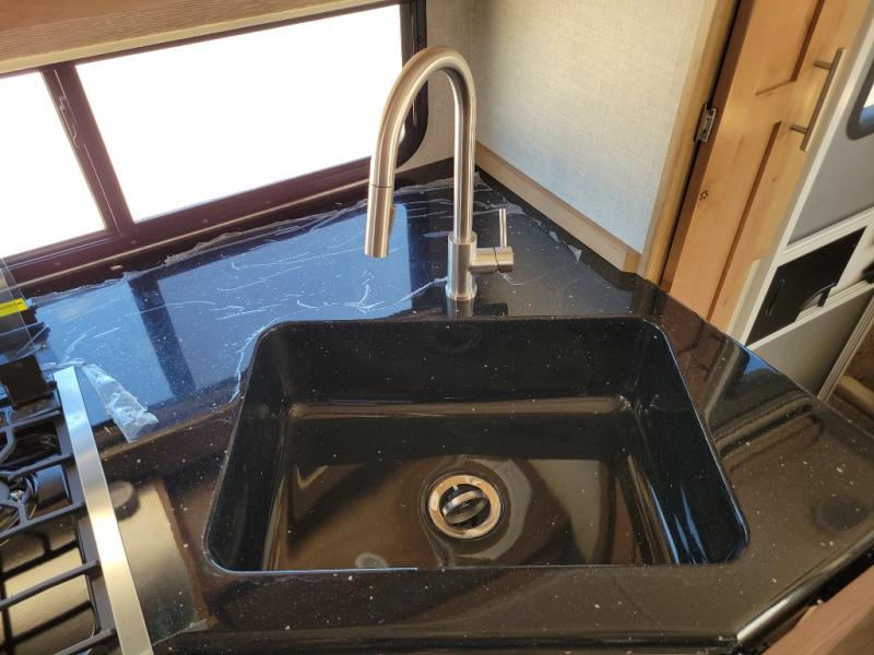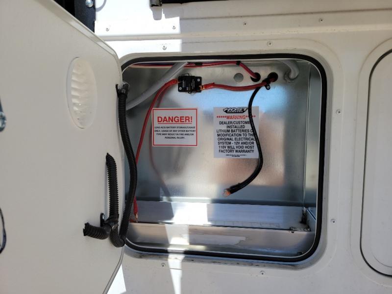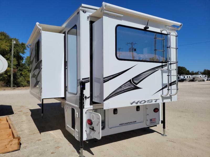 With any Host Industries Host Campers truck camper, there is ease of setting up with electric jacks with a wireless remote, and security when traveling thanks to the heavy duty camper tie down brackets. Each is constructed with two or three slide outs giving you more interior space on an Ultralite 100% aluminum structure with vacuum bonded foam insulated walls, a floor and a ceiling, plus there is a one-piece TPO roof. Some conveniences include an enclosed service center, enclosed and heated holding tanks, large J-rail rain gutters, and access panels for the slide out motors, water tank and holding tanks to mention a few. And the interior is just as impressive from the style, decor choices, the 12 volt LED lighting system, the Grani-coat solid surface countertops, and the many options you can add to customize your Host Camper!