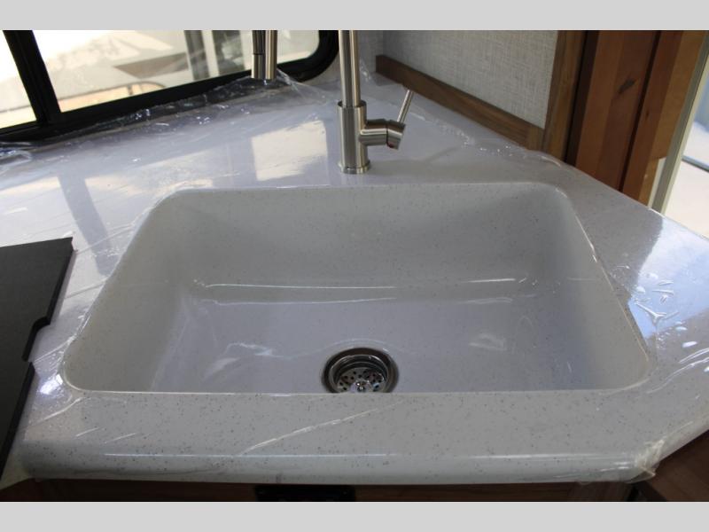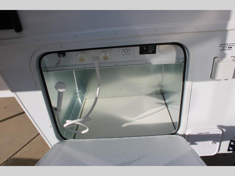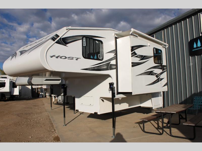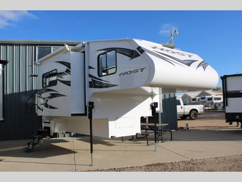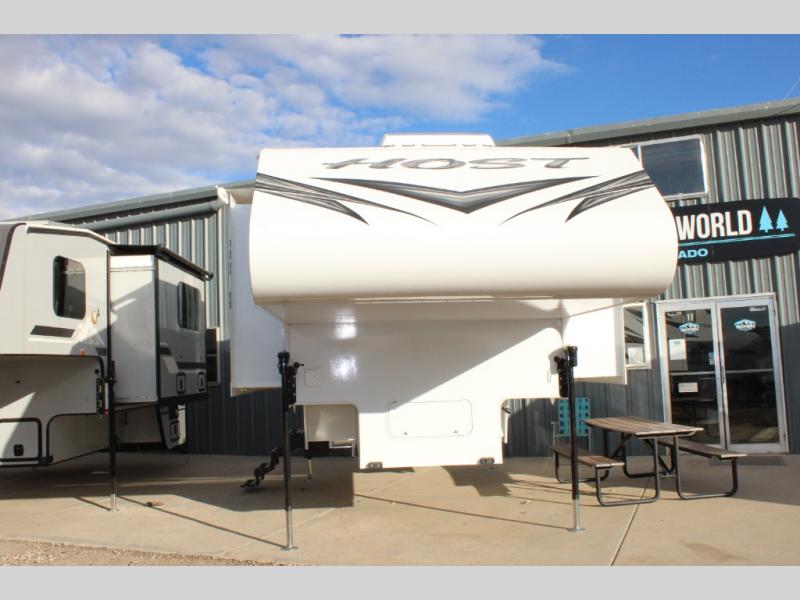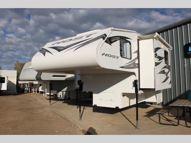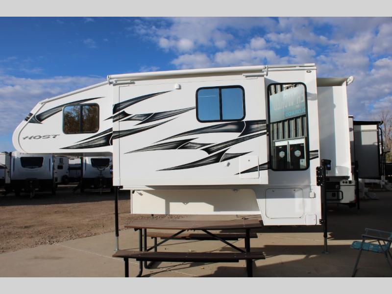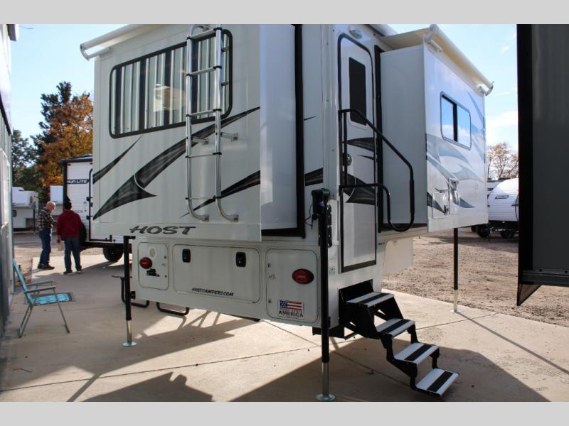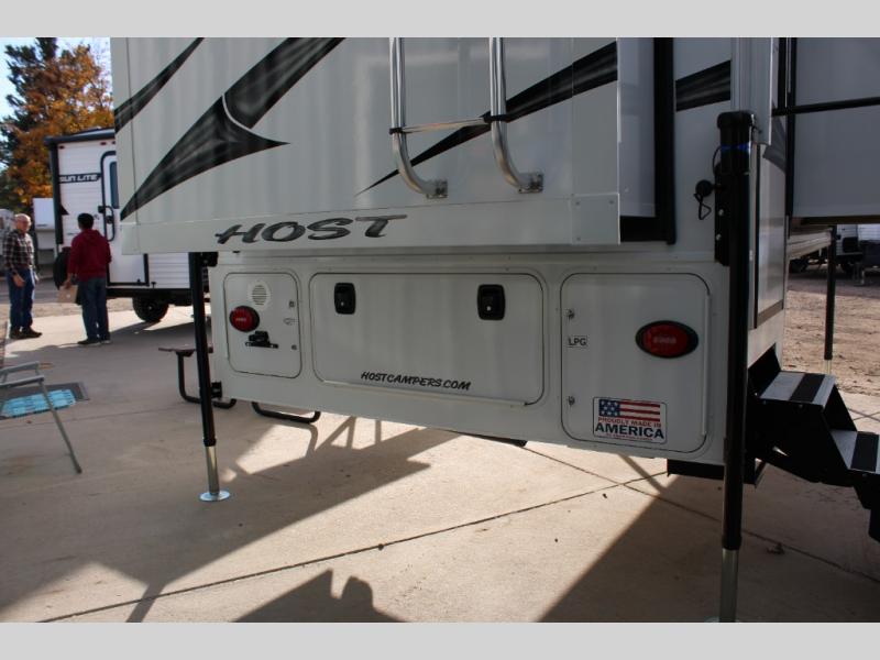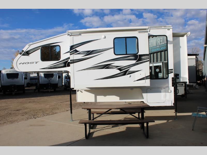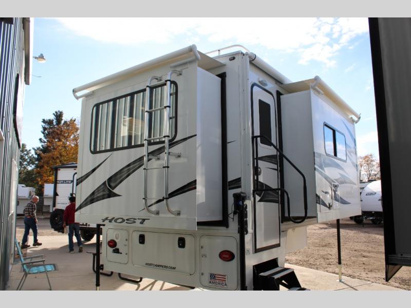 With any Host Industries Host Campers truck camper, there is ease of setting up with electric jacks with a wireless remote, and security when traveling thanks to the heavy duty camper tie down brackets. Each is constructed with two or three slide outs giving you more interior space on an Ultralite 100% aluminum structure with vacuum bonded foam insulated walls, a floor and a ceiling, plus there is a one-piece TPO roof. Some conveniences include an enclosed service center, enclosed and heated holding tanks, large J-rail rain gutters, and access panels for the slide out motors, water tank and holding tanks to mention a few. And the interior is just as impressive from the style, decor choices, the 12 volt LED lighting system, the Grani-coat solid surface countertops, and the many options you can add to customize your Host Camper!