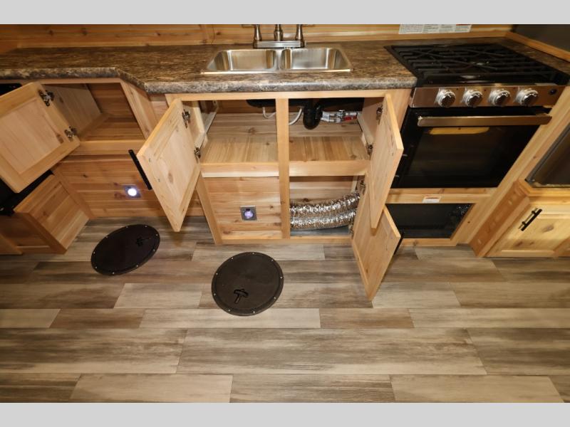 Take your fishing adventure to the next level with this 21V RV Extreme III fish house featuring dual hydraulic frame which easily lowers onto the ice for your fishing season, and also is fully equipped for any summer camping trip. You will love the cedar interior which gives it a true cabin feel, and it has everything you need to enjoy your time on the ice or in the campground. There is sleeping for six with the dual jack knife sofas and 54" electric lift bed in back, plus two 30" bunks up front in the V-nose. A raised bathroom is an added convenience providing you with a shower and toilet while on the ice or in camp. Cooking will be easy, so get the catch of the day ready for the frying pan. There is a three burner cooktop, double sink for cleaning up, and a large refrigerator for your perishables. You will find plenty of cabinets throughout to hold all of your belongings and gear, and the fireplace with TV hook-ups above it make it quite enjoyable when the fishing is done. You will even enjoy the 19' lighted power awning for a bit of outdoor living as well.