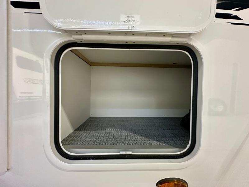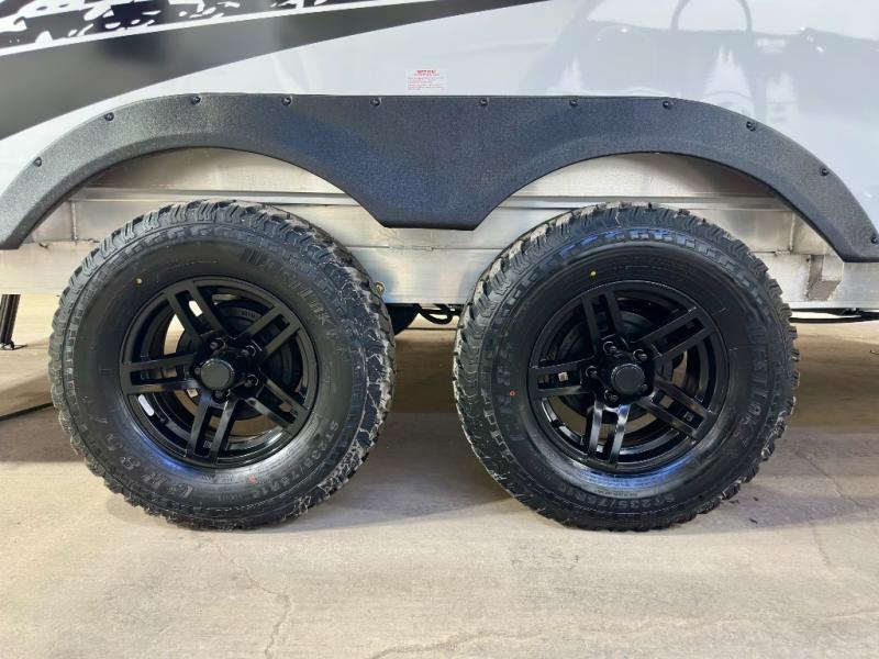 Step inside this travel trailer for fun trips to your state park! There is a front U-shaped dinette that will double as dining and sleeping space for guests, while you enjoy the queen-size bed in the back. You'll find the wet bath to be convenient, especially with its roof vent, mesh shower storage net and porcelain toilet. Each morning you can prepare breakfast on the two burner stainless steel cooktop or in the convection microwave, and there is a 10 cu. ft. 12V refrigerator for your perishables. There are plenty of storage spaces, including overhead cabinets, a nightstand with a drawer, plus a pantry with slide out drawers. This model has a dry weight that ranges from 4,764 lbs. - 5,200 lbs., a tongue weight from 475 lbs. - 500 lbs., and a net carrying capacity from 1,650 lbs. - 1,850 lbs. You may also like to choose the optional Rover Package that includes a 3" lift, an aluminum tube rear bumper, rugged decals, and more!