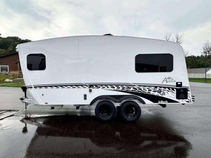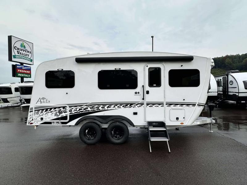 With any Aucta travel trailer by inTech RV you will enjoy creative interior spaces, luxury features, and smart storage spaces for a one-of-a-kind trailer. The one-piece fiberglass roof, all-aluminum cage frame, and Dexter torsion axle provide durable construction and smooth towing, and the fold-away double entry steps and power tongue jack will make set-up easier than ever. Inside, you'll find Infinity woven flooring, a large farmhouse sink, USB ports and 120V outlets, plenty of storage compartments, and MaxxAir vent fans to keep everything fresh. These models also include bubble foil insulation in the walls and ceiling, along with a 25K BTU furnace and a 15K BTU A/C so you can make memories year around!