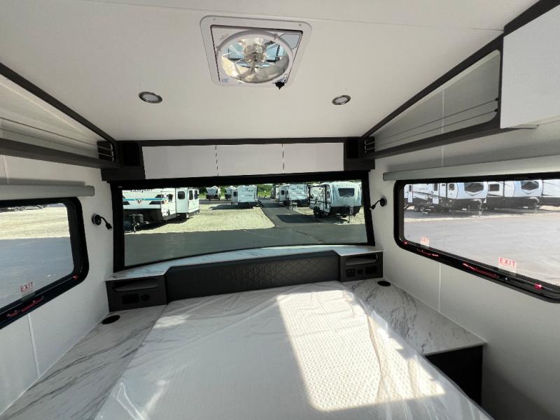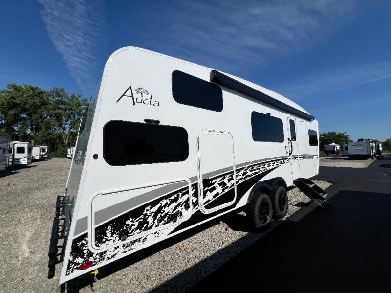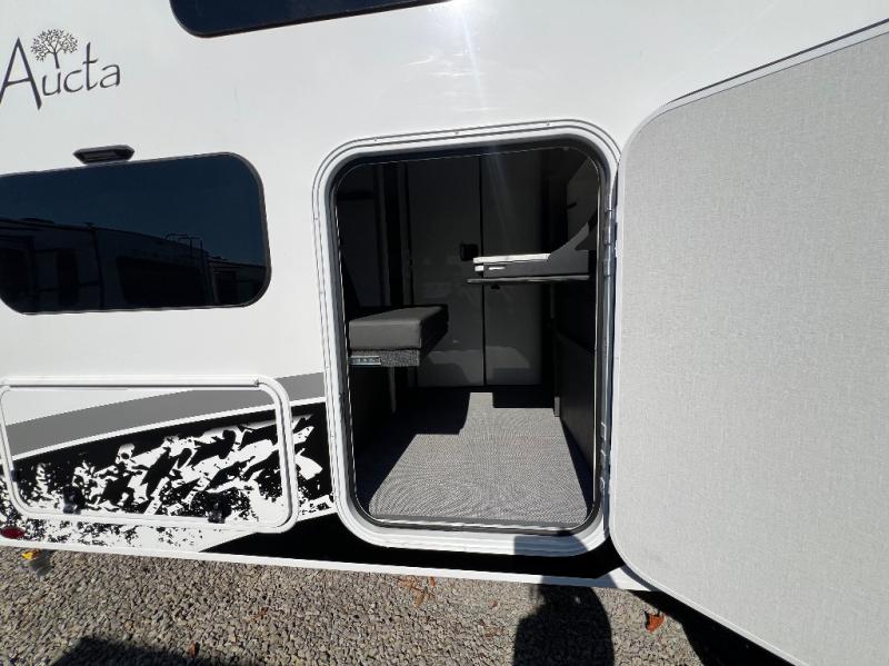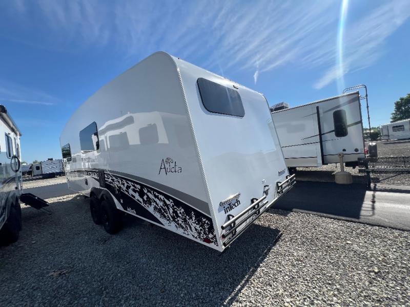 With any Aucta travel trailer by inTech RV you will enjoy creative interior spaces, luxury features, and smart storage spaces for a one-of-a-kind trailer. The one-piece fiberglass roof, all-aluminum cage frame, and Dexter torsion axle provide durable construction and smooth towing, and the fold-away double entry steps and power tongue jack will make set-up easier than ever. Inside, you'll find Infinity woven flooring, a large farmhouse sink, USB ports and 120V outlets, plenty of storage compartments, and MaxxAir vent fans to keep everything fresh. These models also include bubble foil insulation in the walls and ceiling, along with a 25K BTU furnace and a 15K BTU A/C so you can make memories year around!