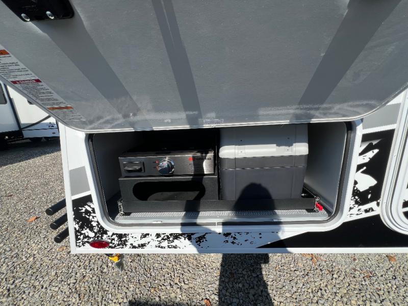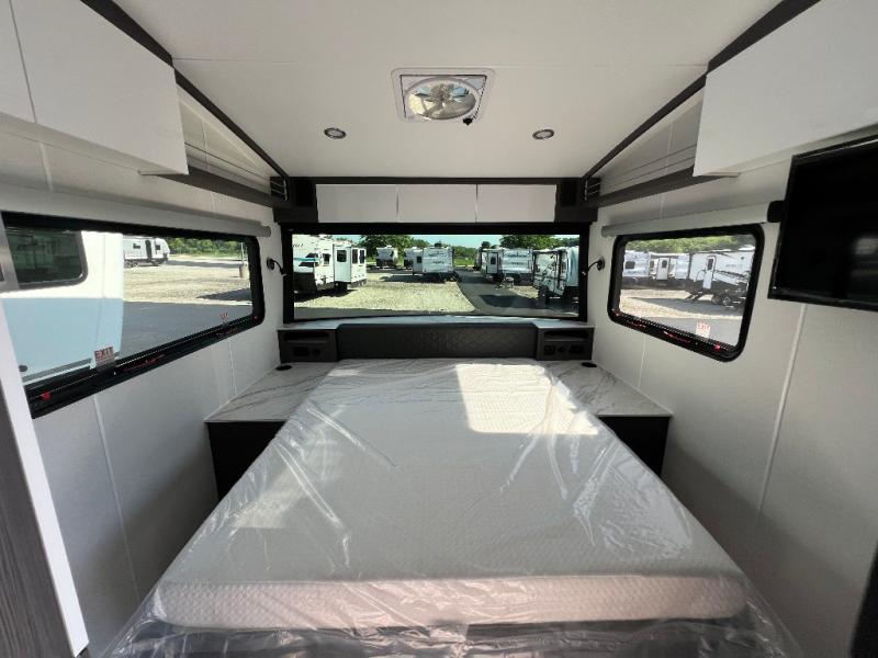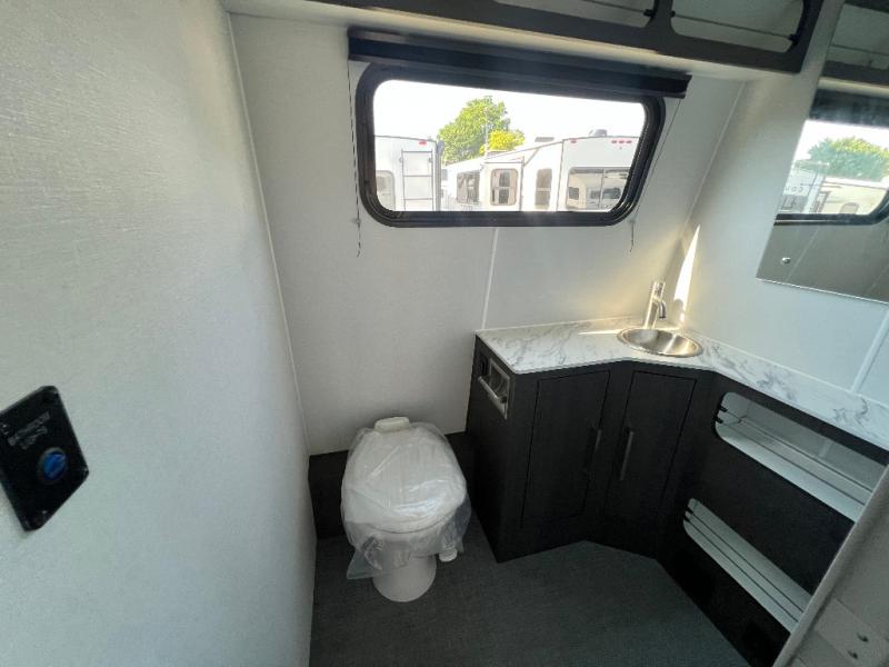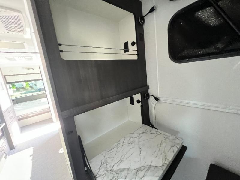 Experience the freedom of the open road in our cozy travel trailer, perfect for families or couples seeking adventure. The full bathroom provides all the essentials for a comfortable stay, and the convenient bunk beds are perfect for kids or guests. The plush sofa is a great spot to relax and unwind after a long day of exploring. The two-burner cooktop allows you to whip up delicious meals on the go, and the 12V refrigerator keeps your food and drinks fresh. The front bedroom is a serene retreat, featuring a spacious queen-size bed and ample storage space. The convection microwave makes cooking and reheating meals a breeze, and the pantry keeps your snacks and ingredients organized. This model also has a dry weight that ranges from 6,750-7,100 lbs., a tongue weight between 700-750 lbs., and a carrying capacity between 2,300-2,650 lbs. You may also like to choose the optional Rover Package that includes a 3" lift, an aluminum tube rear bumper, rugged decals, and more!