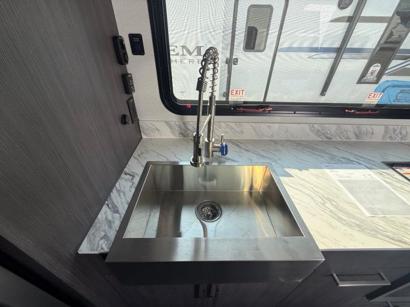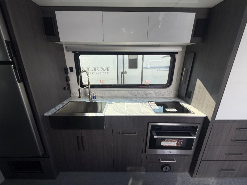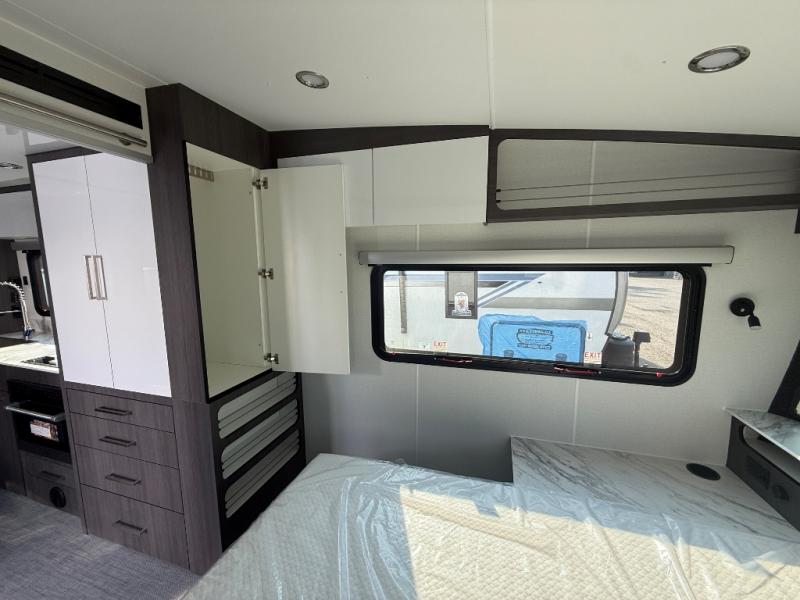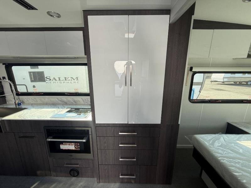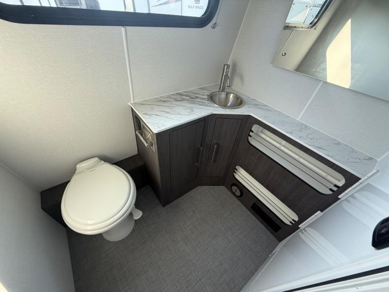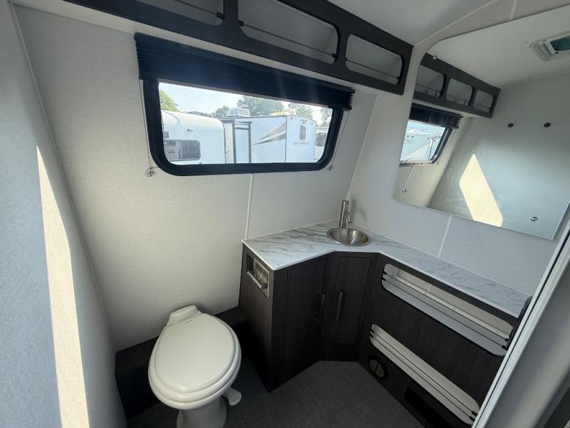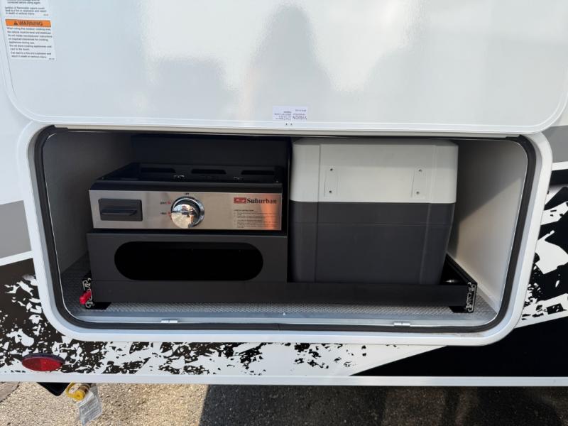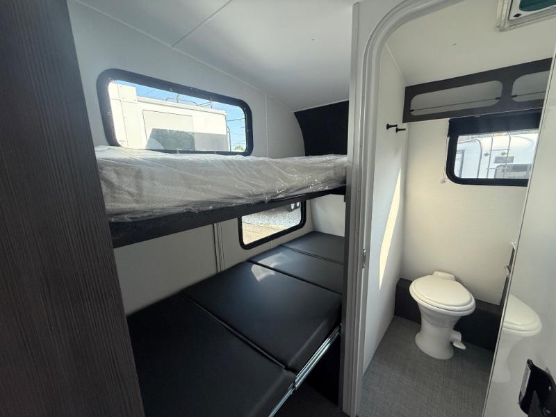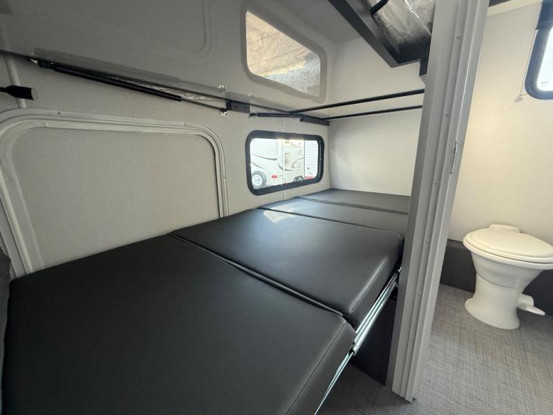 Experience the freedom of the open road in our cozy travel trailer, perfect for families or couples seeking adventure. The full bathroom provides all the essentials for a comfortable stay, and the convenient bunk beds are perfect for kids or guests. The plush sofa is a great spot to relax and unwind after a long day of exploring. The two-burner cooktop allows you to whip up delicious meals on the go, and the 12V refrigerator keeps your food and drinks fresh. The front bedroom is a serene retreat, featuring a spacious queen-size bed and ample storage space. The convection microwave makes cooking and reheating meals a breeze, and the pantry keeps your snacks and ingredients organized. This model also has a dry weight that ranges from 6,750-7,100 lbs., a tongue weight between 700-750 lbs., and a carrying capacity between 2,300-2,650 lbs. You may also like to choose the optional Rover Package that includes a 3" lift, an aluminum tube rear bumper, rugged decals, and more!