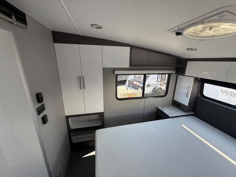 Pack your bags for a new adventure in this Willow travel trailer. You and your spouse or camping friend will love the natural light that streams in from the panoramic windows as you relax on the U-shaped dinette. Prepare meals each day on the two burner stainless steel cooktop or use the convection microwave, and you'll find plenty of overhead cabinets for all your necessities. This model features a private toilet and sink, with the shower right across the hall so two people can freshen up at once. When it's time to call it a night, you can rest comfortably on the walk-around queen bed, and the 32" bedroom TV will allow you to watch a late-night movie in bed! If you like to have your own space at night, just choose the optional twin beds! This model also has a dry weight that ranges from 5,650-5,850 lbs., a tongue weight between 725-790 lbs., and a carrying capacity between 1,650-1,850 lbs. You may also like to choose the optional Rover Package that includes a 3" lift, an aluminum tube rear bumper, rugged decals, and more!