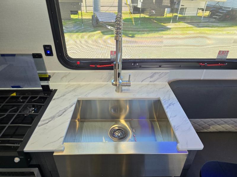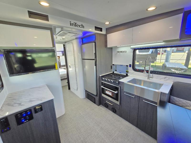 With any Aucta travel trailer by inTech RV you will enjoy creative interior spaces, luxury features, and smart storage spaces for a one-of-a-kind trailer. The one-piece fiberglass roof, all-aluminum cage frame, and Dexter torsion axle provide durable construction and smooth towing, and the fold-away double entry steps and power tongue jack will make set-up easier than ever. Inside, you'll find Infinity woven flooring, a large farmhouse sink, USB ports and 120V outlets, plenty of storage compartments, and MaxxAir vent fans to keep everything fresh. These models also include bubble foil insulation in the walls and ceiling, along with a 25K BTU furnace and a 15K BTU A/C so you can make memories year around!