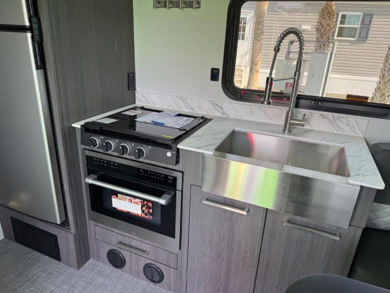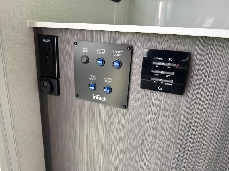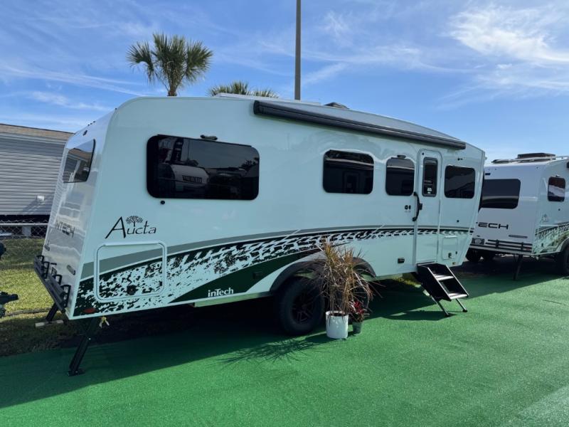 With any Aucta travel trailer by inTech RV you will enjoy creative interior spaces, luxury features, and smart storage spaces for a one-of-a-kind trailer. The one-piece fiberglass roof, all-aluminum cage frame, and Dexter torsion axle provide durable construction and smooth towing, and the fold-away double entry steps and power tongue jack will make set-up easier than ever. Inside, you'll find Infinity woven flooring, a large farmhouse sink, USB ports and 120V outlets, plenty of storage compartments, and MaxxAir vent fans to keep everything fresh. These models also include bubble foil insulation in the walls and ceiling, along with a 25K BTU furnace and a 15K BTU A/C so you can make memories year around!