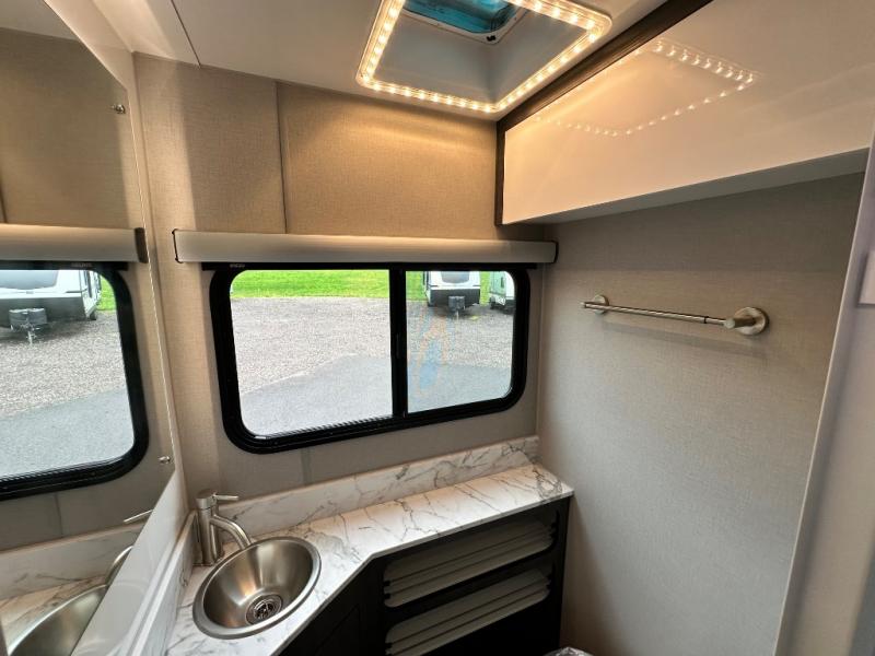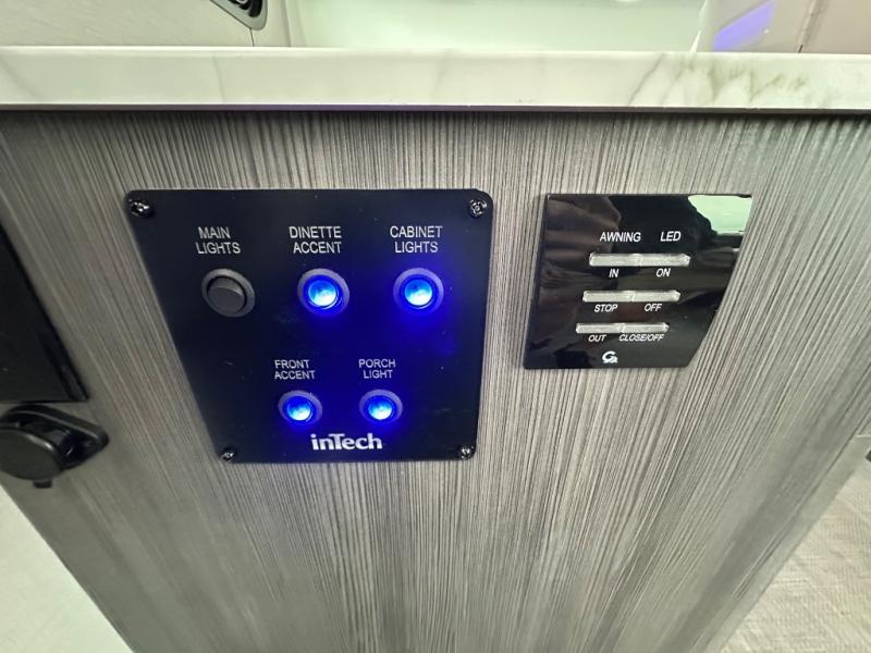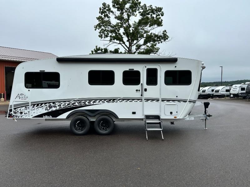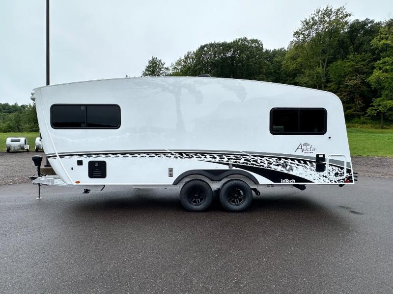 With any Aucta travel trailer by inTech RV you will enjoy creative interior spaces, luxury features, and smart storage spaces for a one-of-a-kind trailer. The one-piece fiberglass roof, all-aluminum cage frame, and Dexter torsion axle provide durable construction and smooth towing, and the fold-away double entry steps and power tongue jack will make set-up easier than ever. Inside, you'll find Infinity woven flooring, a large farmhouse sink, USB ports and 120V outlets, plenty of storage compartments, and MaxxAir vent fans to keep everything fresh. These models also include bubble foil insulation in the walls and ceiling, along with a 25K BTU furnace and a 15K BTU A/C so you can make memories year around!