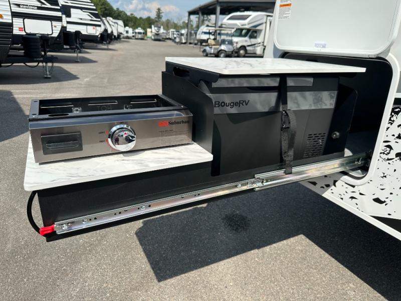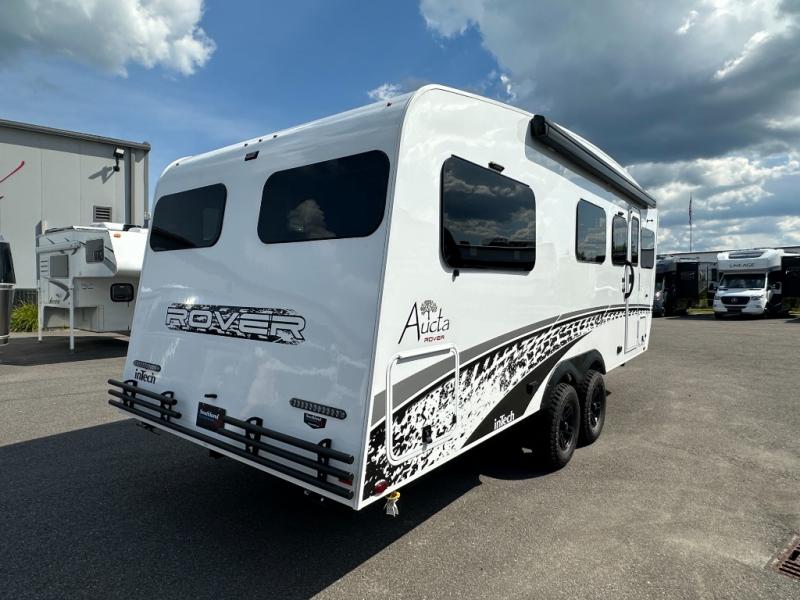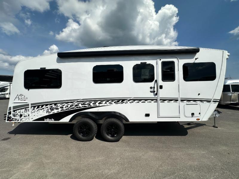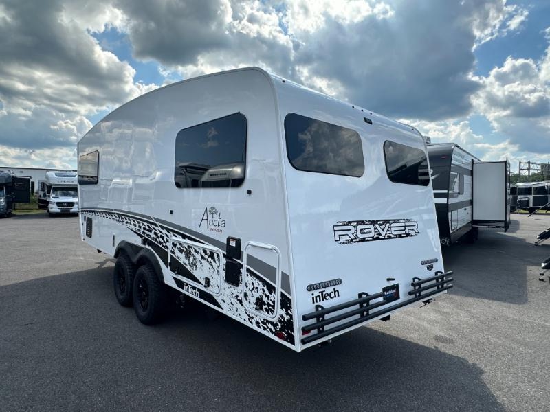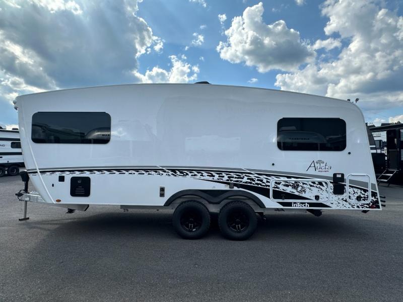 With any Aucta travel trailer by inTech RV you will enjoy creative interior spaces, luxury features, and smart storage spaces for a one-of-a-kind trailer. The one-piece fiberglass roof, all-aluminum cage frame, and Dexter torsion axle provide durable construction and smooth towing, and the fold-away double entry steps and power tongue jack will make set-up easier than ever. Inside, you'll find Infinity woven flooring, a large farmhouse sink, USB ports and 120V outlets, plenty of storage compartments, and MaxxAir vent fans to keep everything fresh. These models also include bubble foil insulation in the walls and ceiling, along with a 25K BTU furnace and a 15K BTU A/C so you can make memories year around!