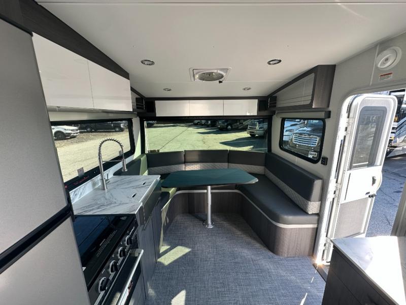 Pack your bags for a new adventure in this Willow travel trailer. You and your spouse or camping friend will love the natural light that streams in from the panoramic windows as you relax on the U-shaped dinette. Prepare meals each day on the two burner stainless steel cooktop or use the convection microwave, and you'll find plenty of overhead cabinets for all your necessities. This model features a private toilet and sink, with the shower right across the hall so two people can freshen up at once. When it's time to call it a night, you can rest comfortably on the twin beds, and the 32" bedroom TV will allow you to watch a late-night movie in bed! If you like to have your own space at night. This model also has a dry weight that ranges from 5,650-5,850 lbs., a tongue weight between 725-790 lbs., and a carrying capacity between 1,650-1,850 lbs.