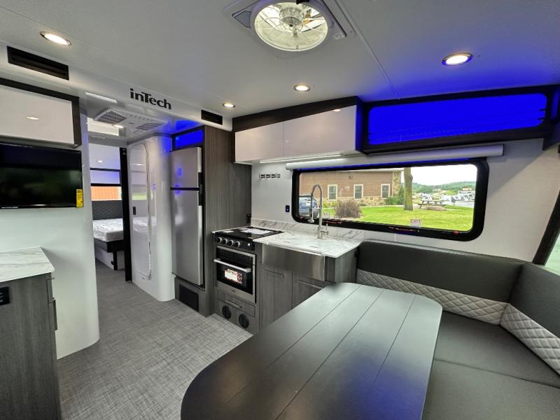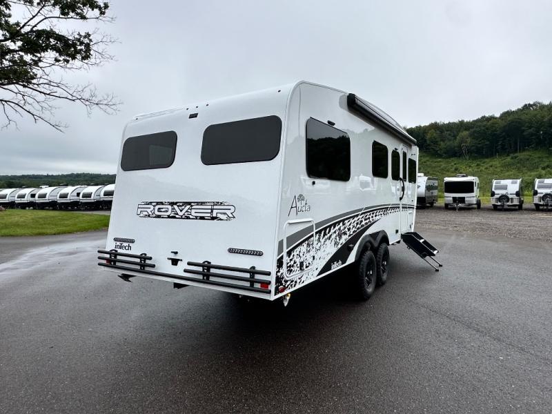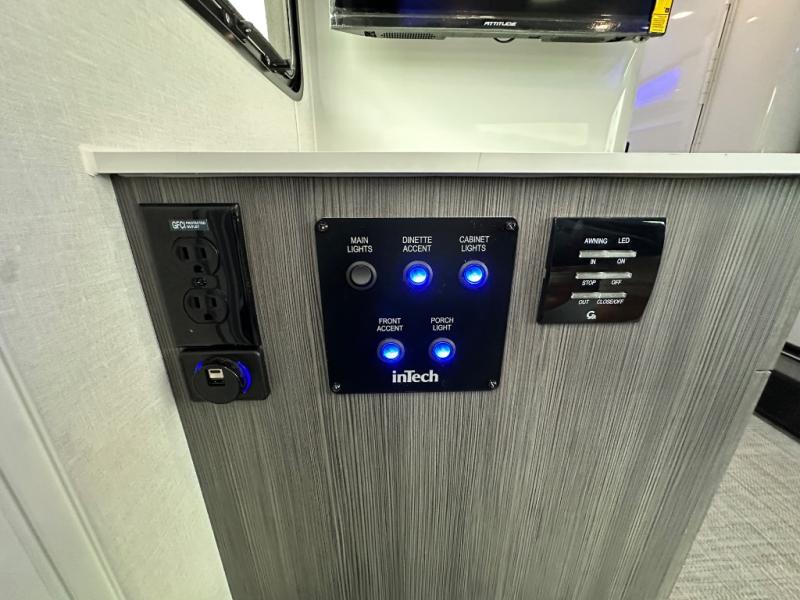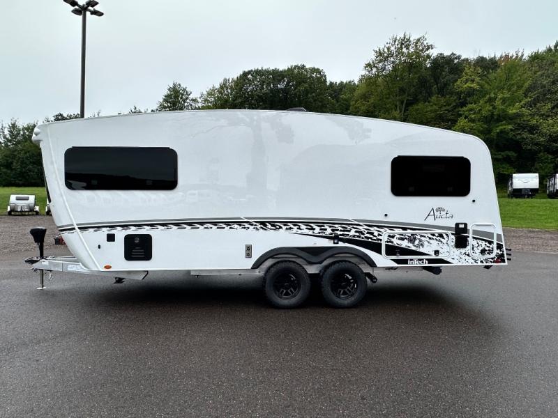 With any Aucta travel trailer by inTech RV you will enjoy creative interior spaces, luxury features, and smart storage spaces for a one-of-a-kind trailer. The one-piece fiberglass roof, all-aluminum cage frame, and Dexter torsion axle provide durable construction and smooth towing, and the fold-away double entry steps and power tongue jack will make set-up easier than ever. Inside, you'll find Infinity woven flooring, a large farmhouse sink, USB ports and 120V outlets, plenty of storage compartments, and MaxxAir vent fans to keep everything fresh. These models also include bubble foil insulation in the walls and ceiling, along with a 25K BTU furnace and a 15K BTU A/C so you can make memories year around!