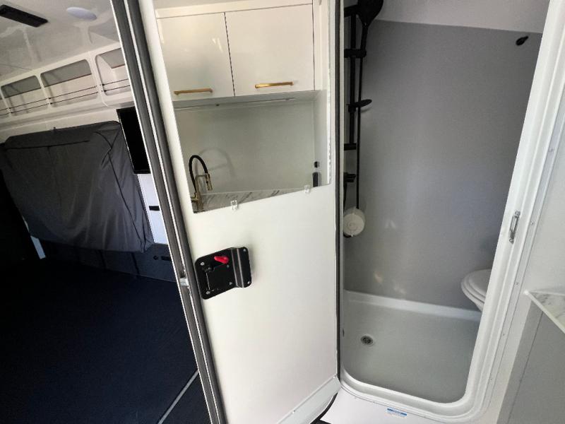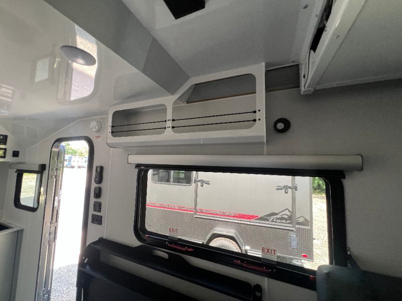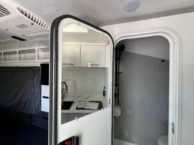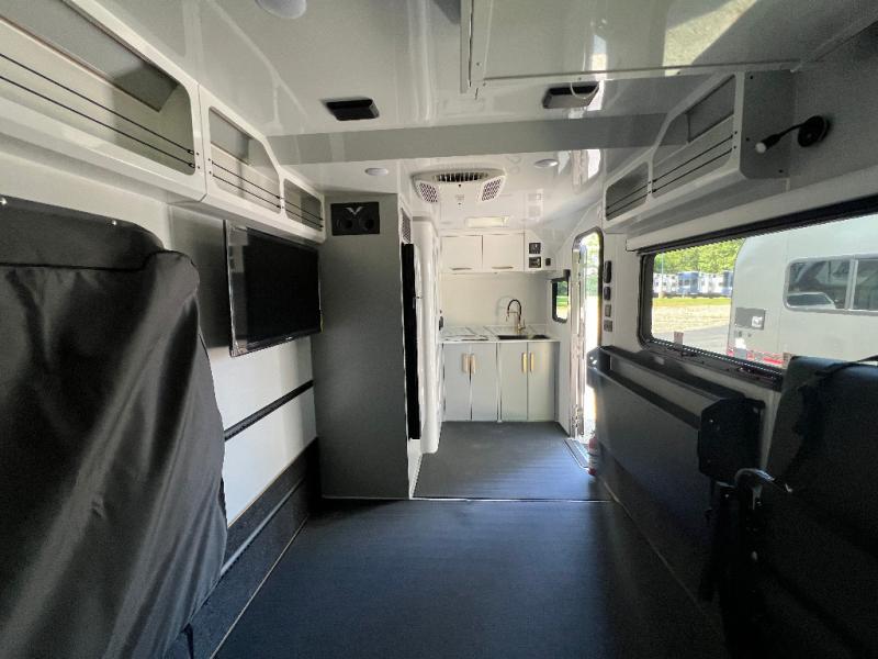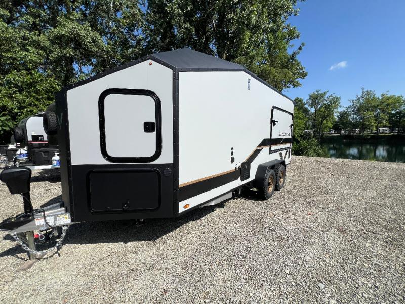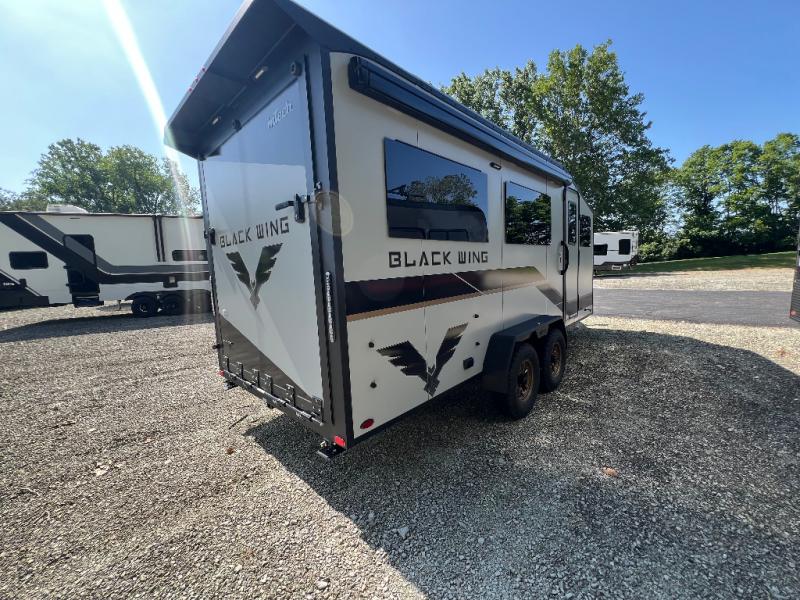 With any Black Wing toy hauler travel trailer by inTech RV, you will durable construction thanks to the fully welded cage and frame construction. There is also a one-piece aluminum roof, a power tongue jack, and solar prep outside for off-grid capabilities. The interior features ample storage space, a MaxxAir vent, a large farmhouse style sink with a gold faucet, and a Bluetooth stereo plus a Smart TV to keep you entertained. Additional features include USB and 120V outlets, an on-demand water heater, aluminum garage flooring, and available options to further customize your toy hauler!