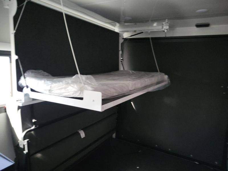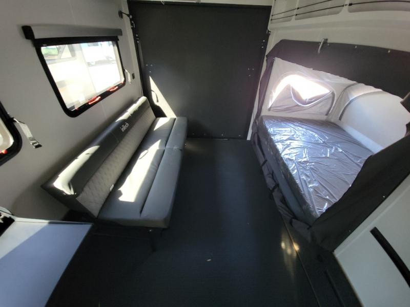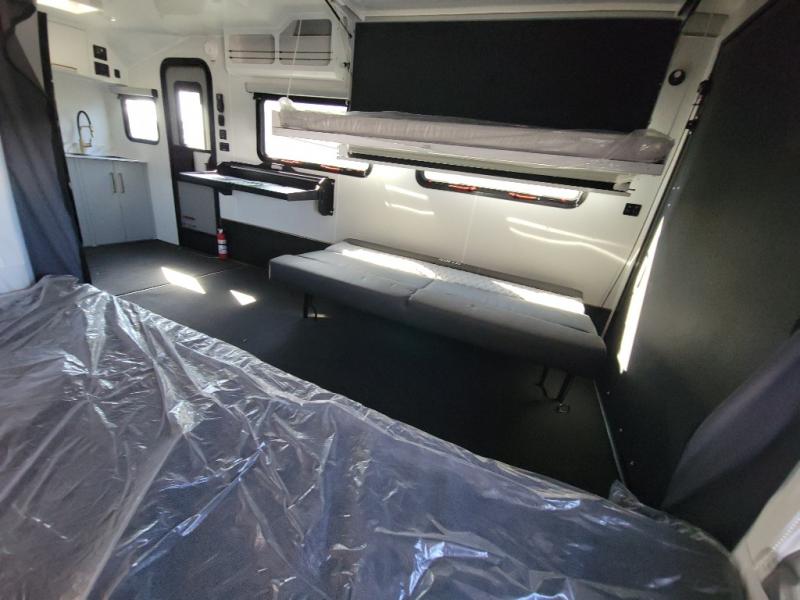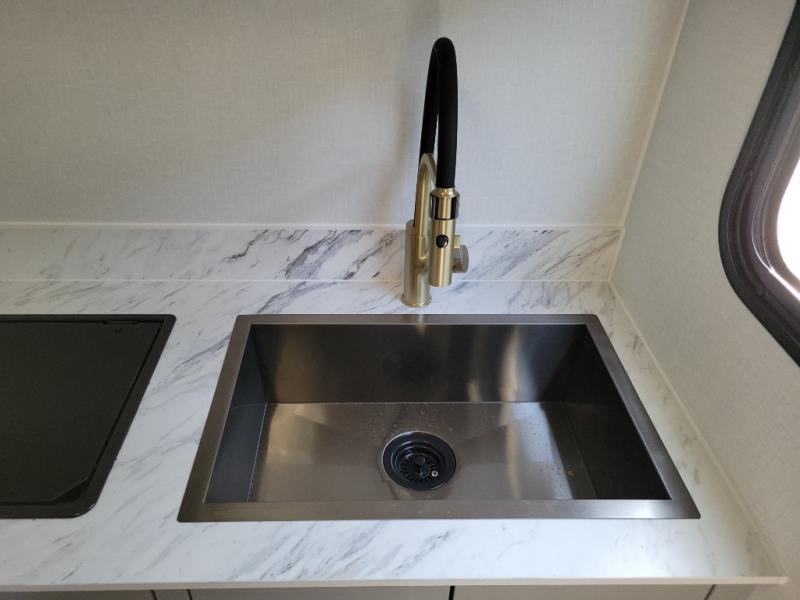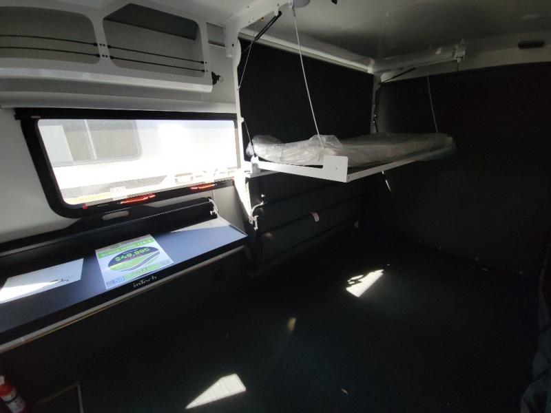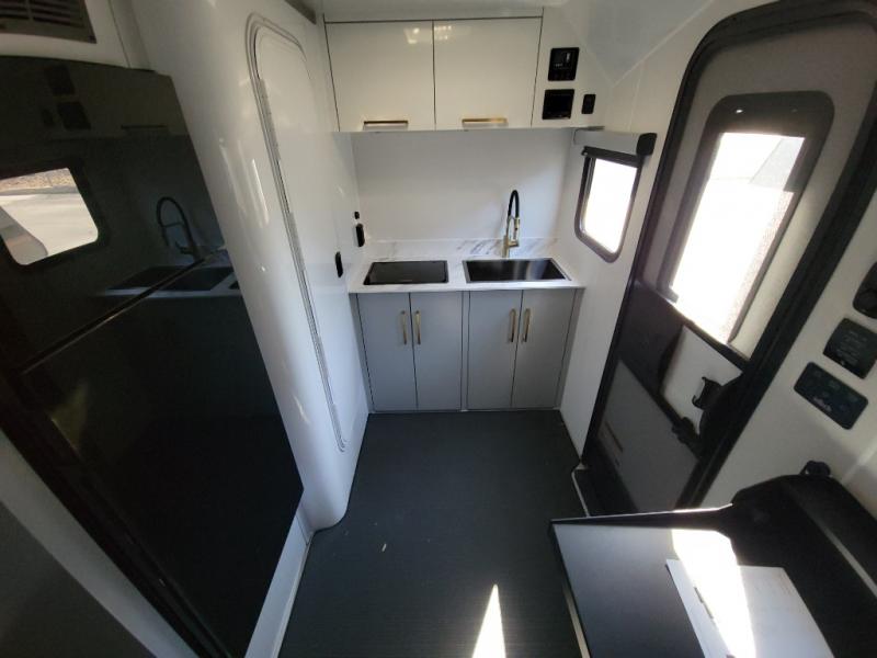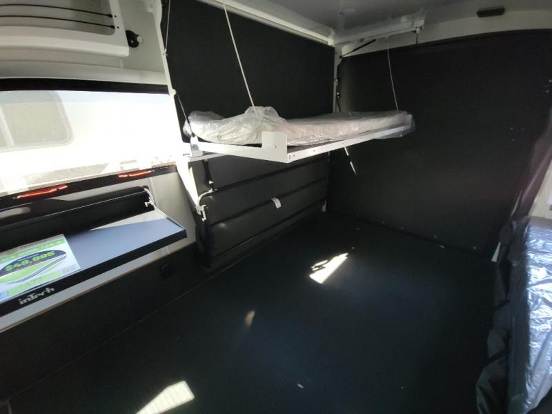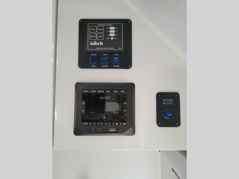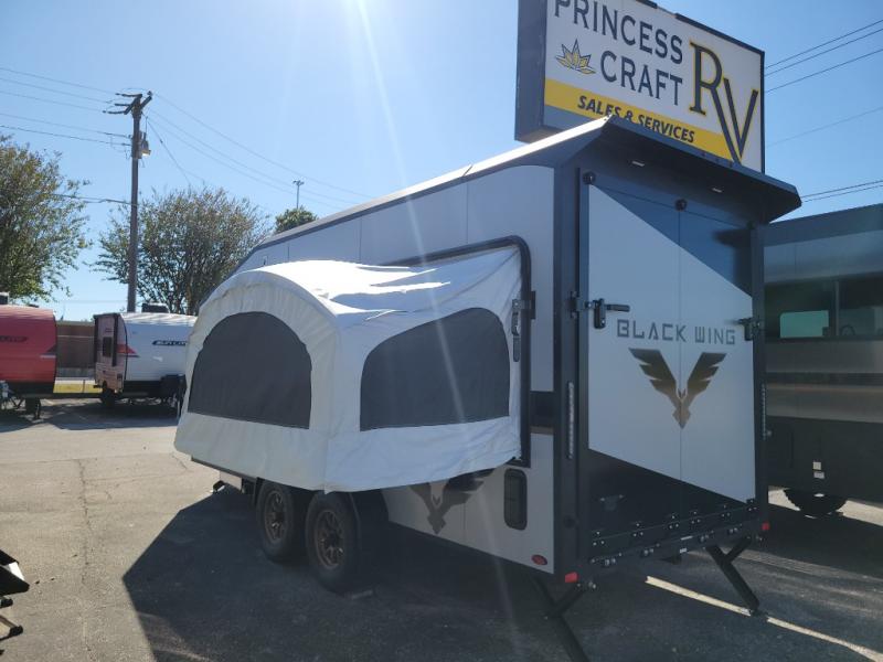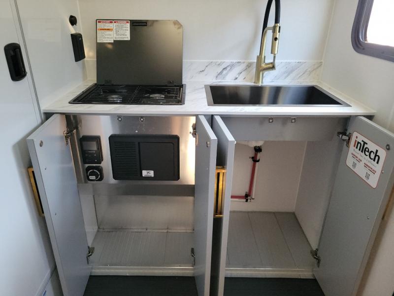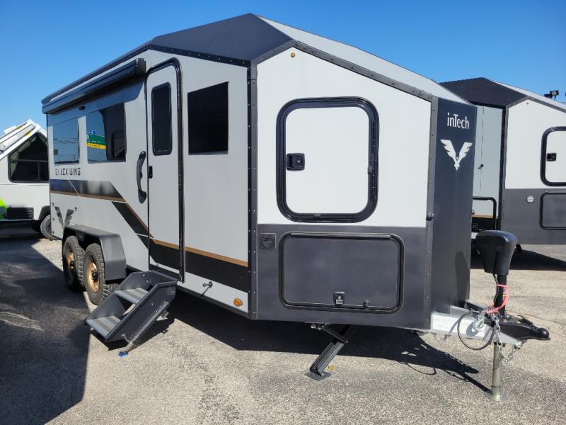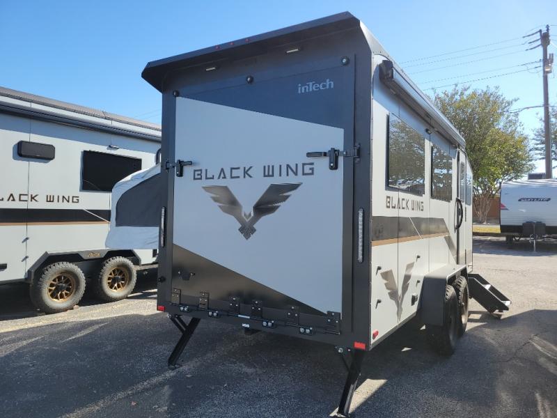With any Black Wing toy hauler travel trailer by inTech RV, you will durable construction thanks to the fully welded cage and frame construction. There is also a one-piece aluminum roof, a power tongue jack, and solar prep outside for off-grid capabilities. The interior features ample storage space, a MaxxAir vent, a large farmhouse style sink with a gold faucet, and a Bluetooth stereo plus a Smart TV to keep you entertained. Additional features include USB and 120V outlets, an on-demand water heater, aluminum garage flooring, and available options to further customize your toy hauler!