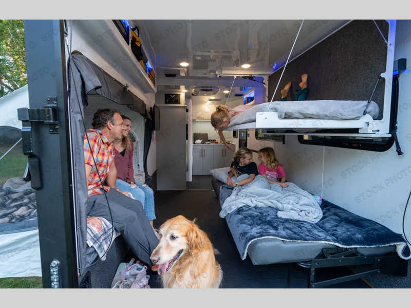 With any Black Wing toy hauler travel trailer by inTech RV, you will durable construction thanks to the fully welded cage and frame construction. There is also a one-piece aluminum roof, a power tongue jack, and solar prep outside for off-grid capabilities. The interior features ample storage space, a MaxxAir vent, a large farmhouse style sink with a gold faucet, and a Bluetooth stereo plus a Smart TV to keep you entertained. Additional features include USB and 120V outlets, an on-demand water heater, aluminum garage flooring, and available options to further customize your toy hauler!