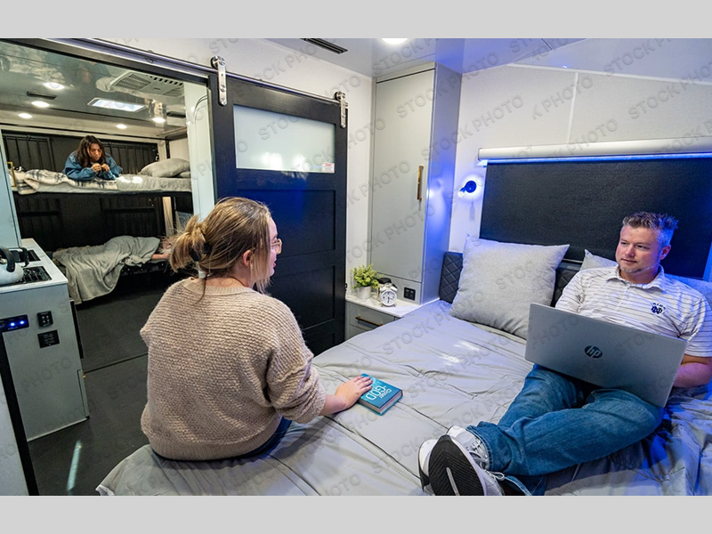 This spacious toy hauler is perfect for your toys, personal belongings, and more! There is 13' 3" total garage space when you utilize the space up to the wet bath, and the eight tie-down rings will keep everything secure. You'll enjoy the front bedroom with a queen bed with memory foam, a MaxxAir vent, and a 32" Smart TV. If you're needing more sleeping space, you can choose to add the optional Happijac queen bed and optional Happijac sofa beds. A full kitchen includes a two burner cooktop and a 10 cu. ft. 12V refrigerator, along with a fold-down removable table for dining space. And if you enjoy cooking outdoors, the optional exterior slide out kitchen can easily be added. The dry weight for this model ranges from 6,000 lbs. - 6,500 lbs., the carrying capacity ranges from 2,000 lbs. - 2,500 lbs., and the tongue weight ranges from 820 lbs. - 1,100 lbs.