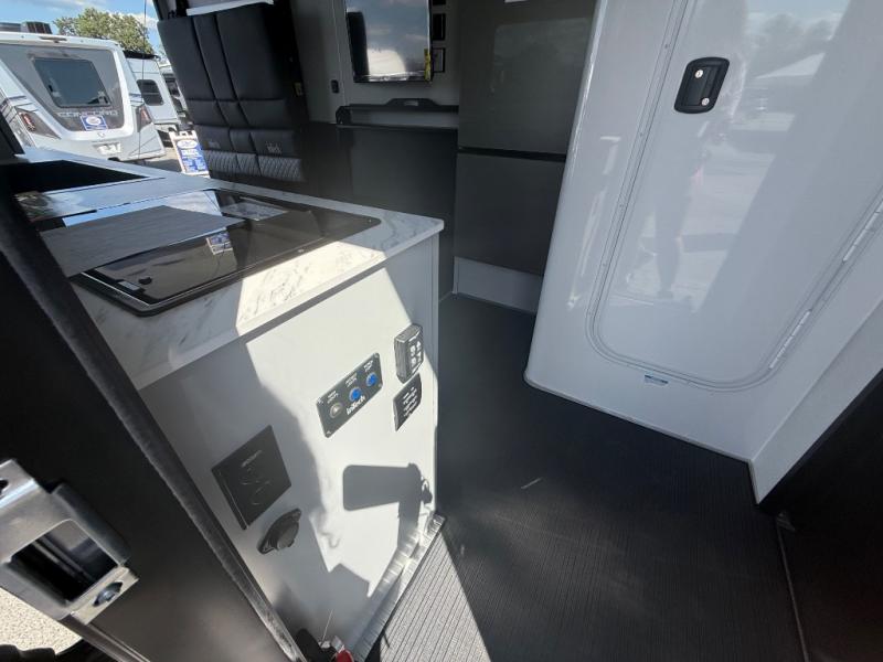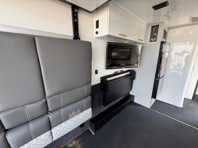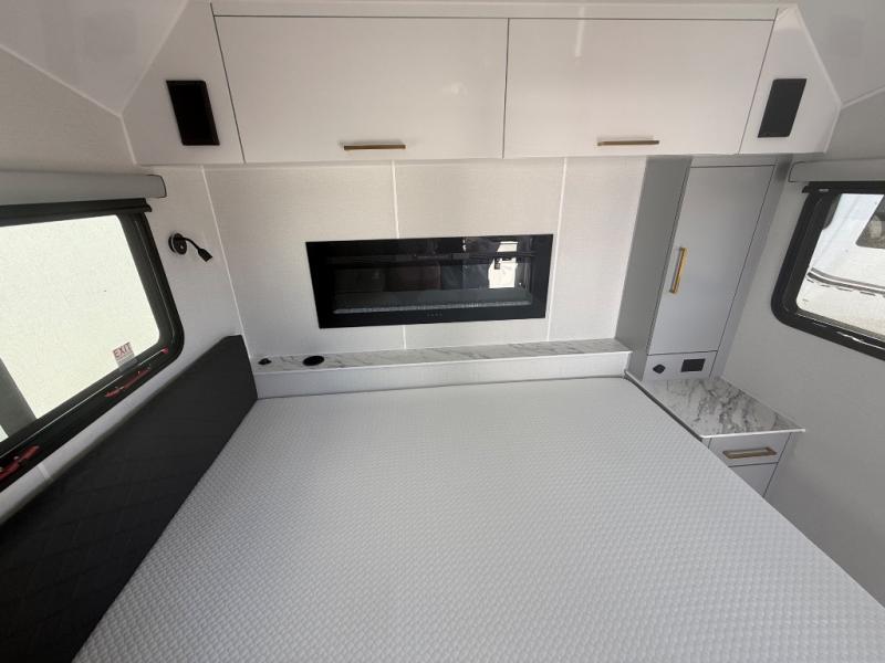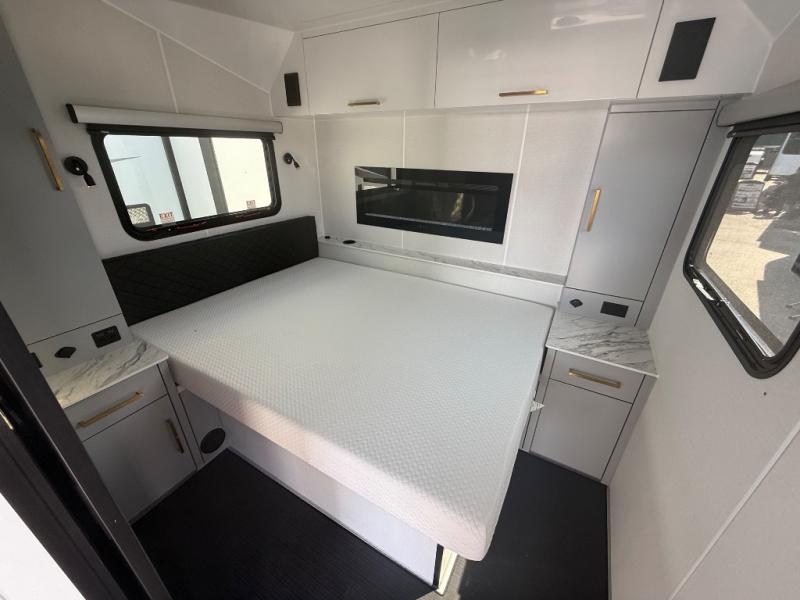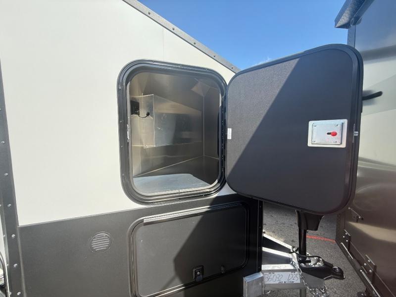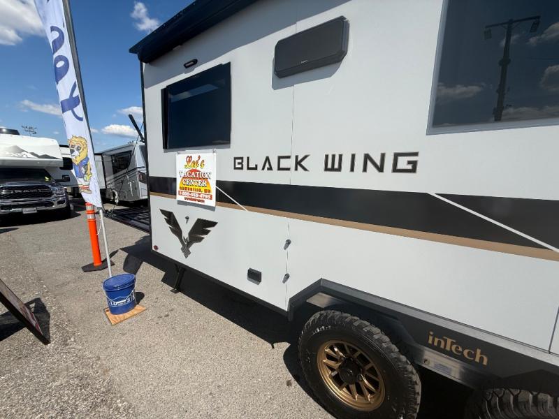 With any Black Wing toy hauler travel trailer by inTech RV, you will durable construction thanks to the fully welded cage and frame construction. There is also a one-piece aluminum roof, a power tongue jack, and solar prep outside for off-grid capabilities. The interior features ample storage space, a MaxxAir vent, a large farmhouse style sink with a gold faucet, and a Bluetooth stereo plus a Smart TV to keep you entertained. Additional features include USB and 120V outlets, an on-demand water heater, aluminum garage flooring, and available options to further customize your toy hauler!
