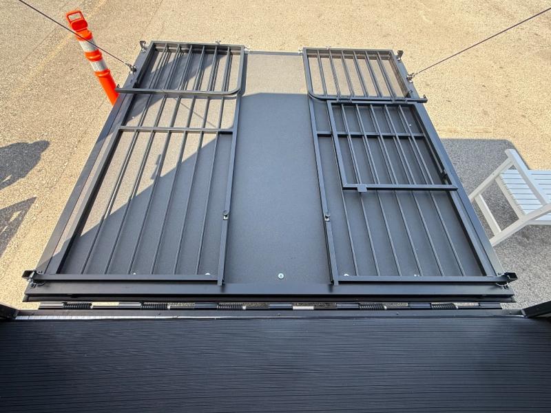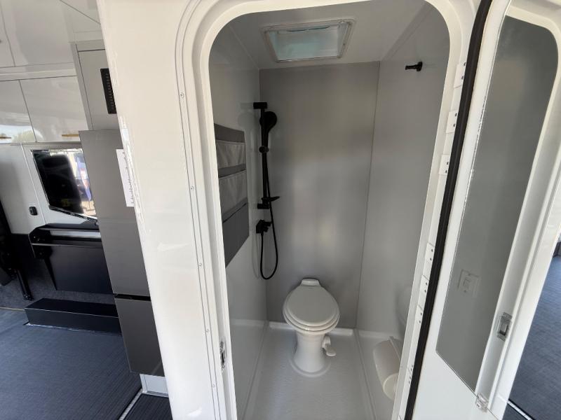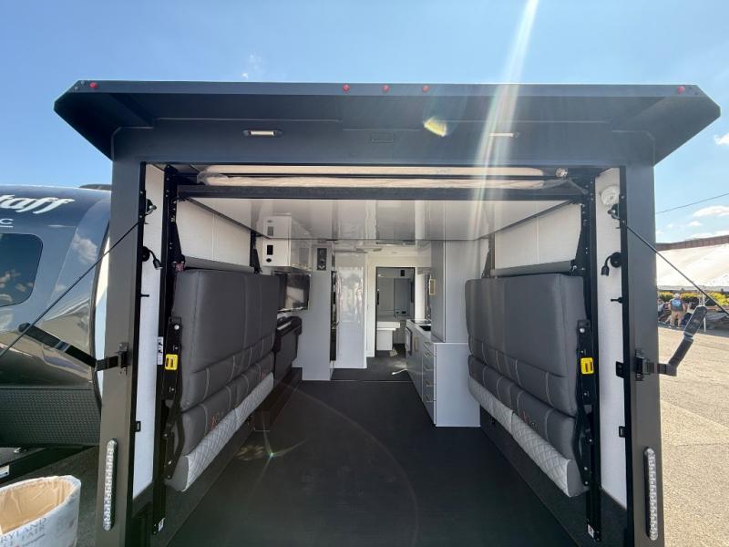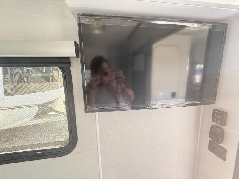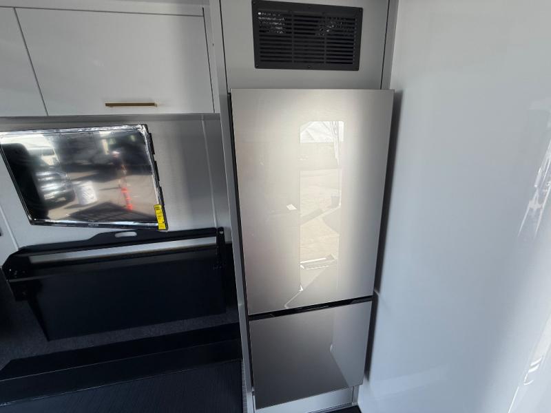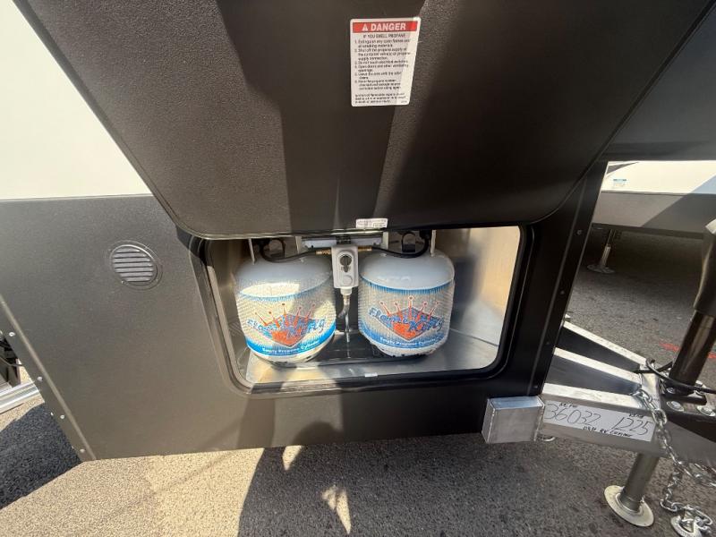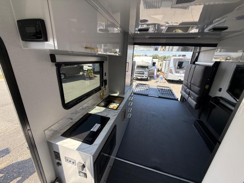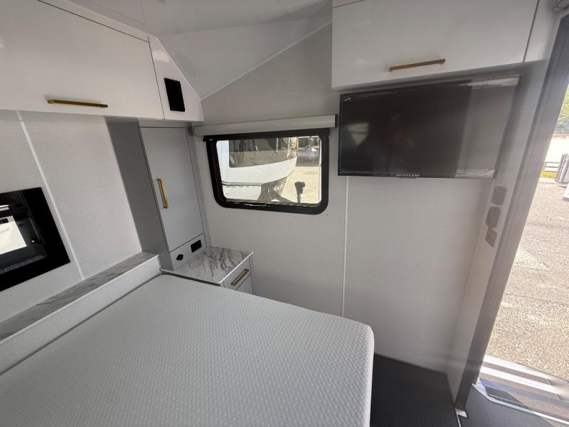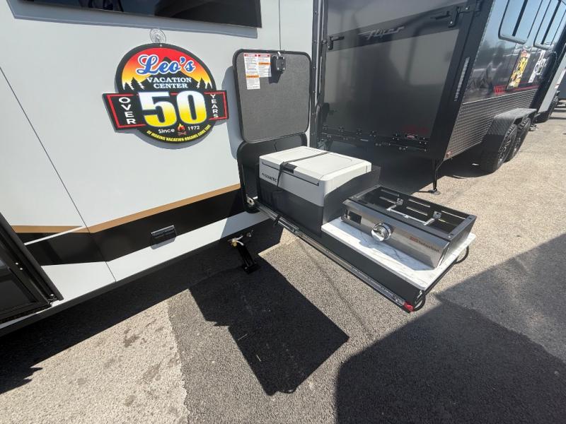 This spacious toy hauler is perfect for your toys, personal belongings, and more! There is 13' 3" total garage space when you utilize the space up to the wet bath, and the eight tie-down rings will keep everything secure. You'll enjoy the front bedroom with a queen bed with memory foam, a MaxxAir vent, and a 32" Smart TV. If you're needing more sleeping space, you can choose to add the optional Happijac queen bed and optional Happijac sofa beds. A full kitchen includes a two burner cooktop and a 10 cu. ft. 12V refrigerator, along with a fold-down removable table for dining space. And if you enjoy cooking outdoors, the optional exterior slide out kitchen can easily be added. The dry weight for this model ranges from 6,000 lbs. - 6,500 lbs., the carrying capacity ranges from 2,000 lbs. - 2,500 lbs., and the tongue weight ranges from 820 lbs. - 1,100 lbs.