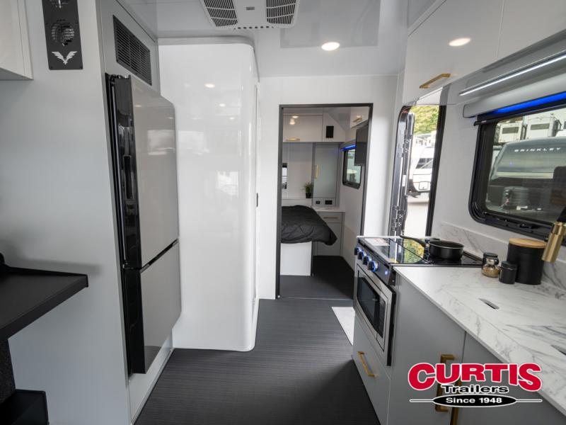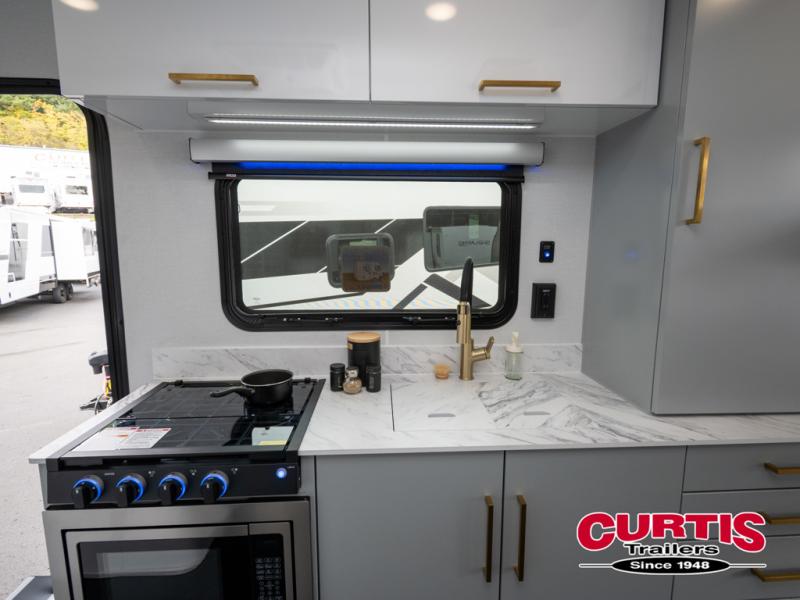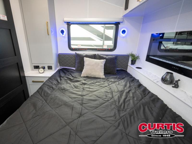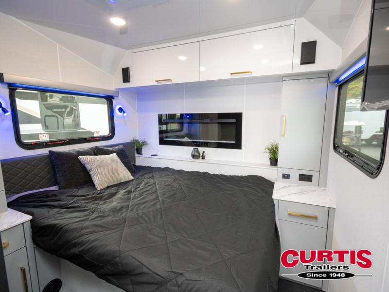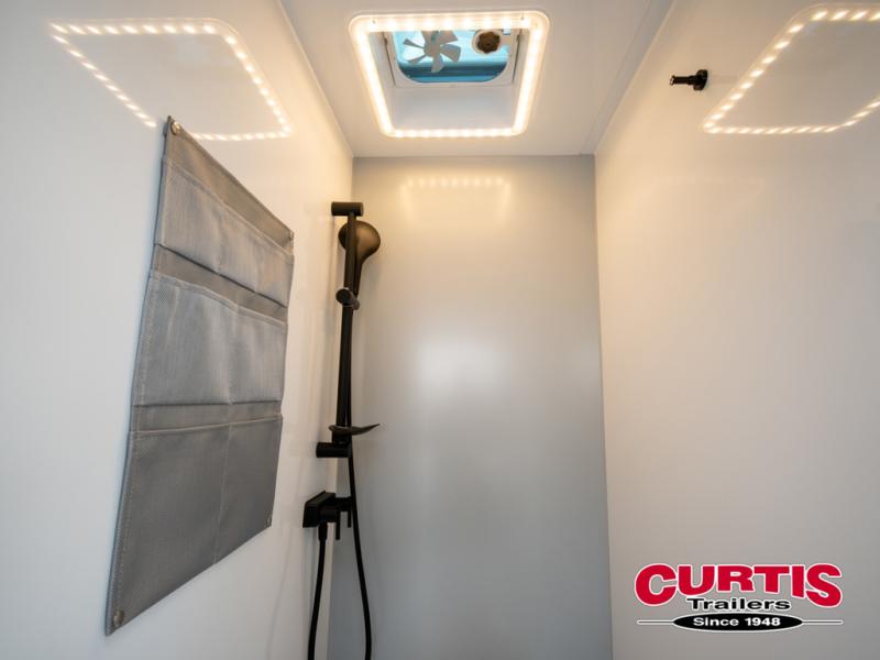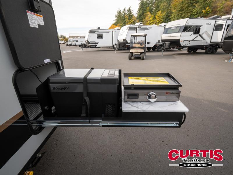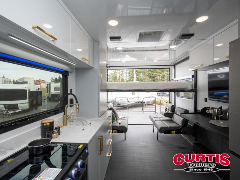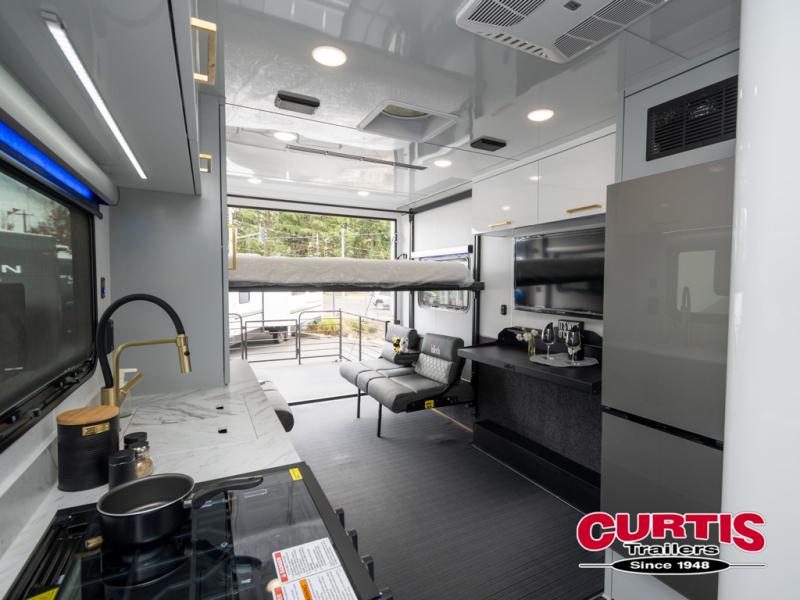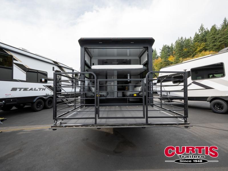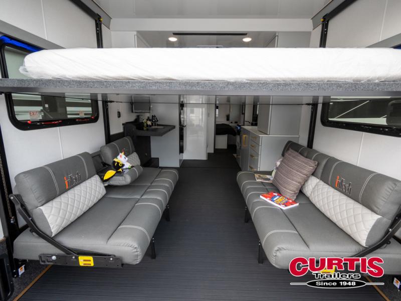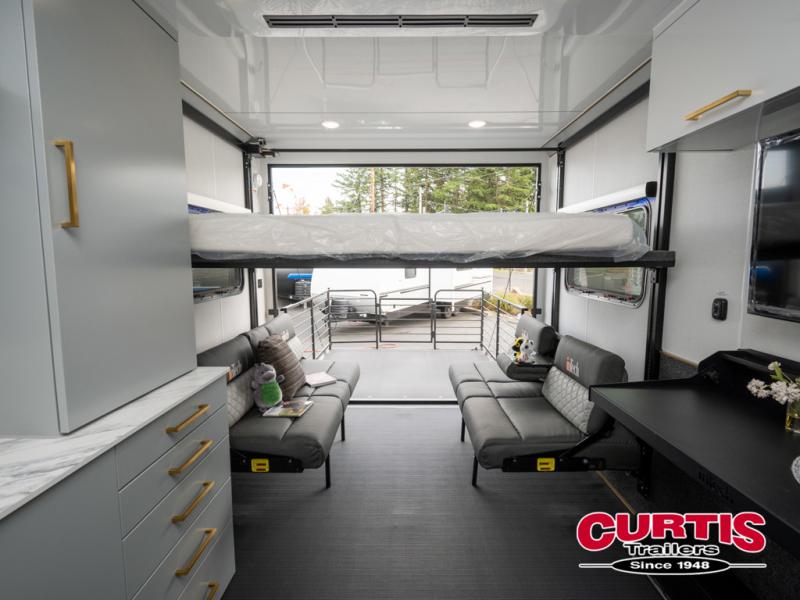 This spacious toy hauler is perfect for your toys, personal belongings, and more! There is 13' 3" total garage space when you utilize the space up to the wet bath, and the eight tie-down rings will keep everything secure. You'll enjoy the front bedroom with a queen bed with memory foam, a MaxxAir vent, and a 32" Smart TV. If you're needing more sleeping space, you can choose to add the optional Happijac queen bed and optional Happijac sofa beds. A full kitchen includes a two burner cooktop and a 10 cu. ft. 12V refrigerator, along with a fold-down removable table for dining space. And if you enjoy cooking outdoors, the optional exterior slide out kitchen can easily be added. The dry weight for this model ranges from 6,000 lbs. - 6,500 lbs., the carrying capacity ranges from 2,000 lbs. - 2,500 lbs., and the tongue weight ranges from 820 lbs. - 1,100 lbs.