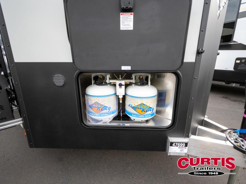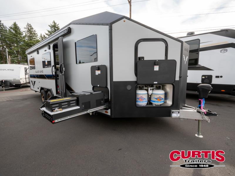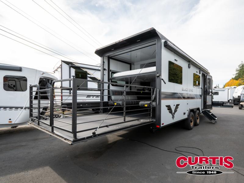 With any Black Wing toy hauler travel trailer by inTech RV, you will durable construction thanks to the fully welded cage and frame construction. There is also a one-piece aluminum roof, a power tongue jack, and solar prep outside for off-grid capabilities. The interior features ample storage space, a MaxxAir vent, a large farmhouse style sink with a gold faucet, and a Bluetooth stereo plus a Smart TV to keep you entertained. Additional features include USB and 120V outlets, an on-demand water heater, aluminum garage flooring, and available options to further customize your toy hauler!