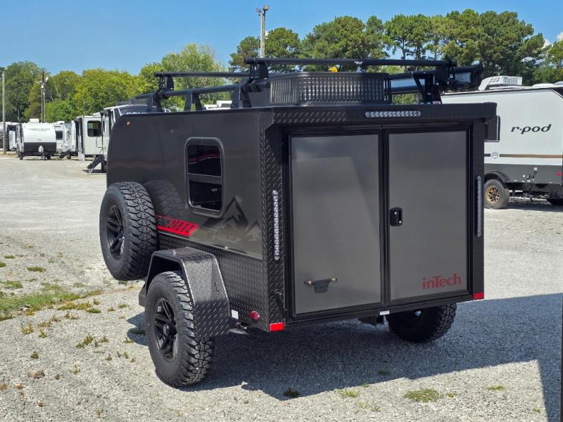 The inTech RV Flyer travel trailers and toy hauler expandables are ready for adventure whenever you are! With the all-aluminum, all-tube cage frame, the Flyer has been built with lightweight and long-lasting materials so that you can enjoy your unit for many, many years. The Flyer has a rugged design so that you can confidently explore new territory and go where traditional RVs cannot. The Flyer has a 2" rear receiver rated for 175 pounds which allows you to bring along your bikes, and the Bluetooth stereo has two speakers you can always have your best music playing. The optional roof rack will allow you to bring along kayaks, and there are more available options depending on the model you choose.
