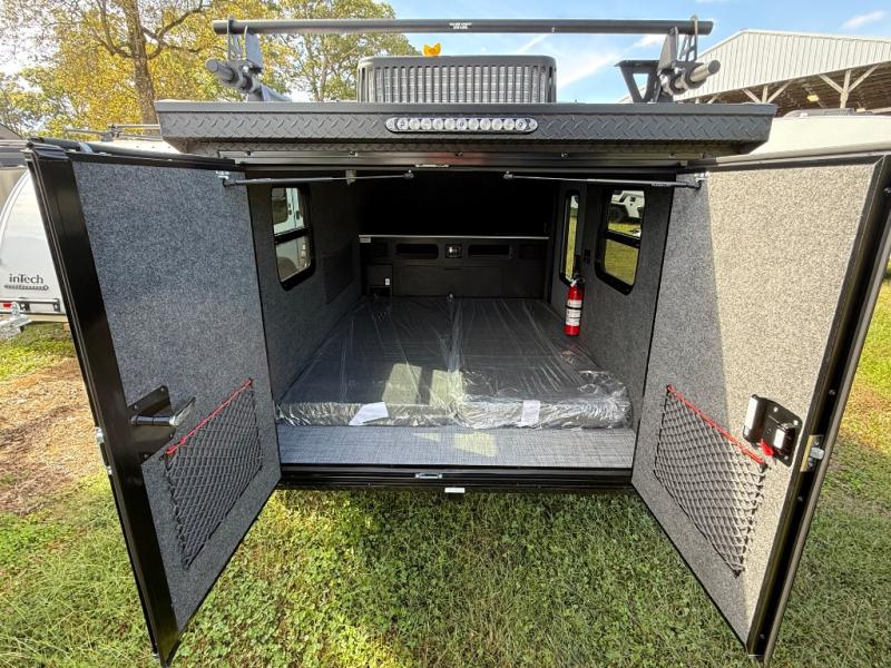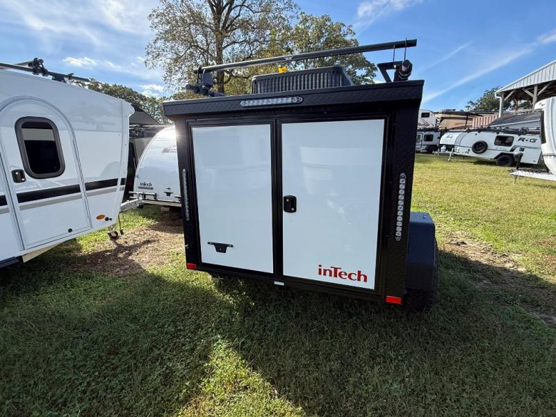 The inTech RV Flyer travel trailers and toy hauler expandables are ready for adventure whenever you are! With the all-aluminum, all-tube cage frame, the Flyer has been built with lightweight and long-lasting materials so that you can enjoy your unit for many, many years. The Flyer has a rugged design so that you can confidently explore new territory and go where traditional RVs cannot. The Flyer has a 2" rear receiver rated for 175 pounds which allows you to bring along your bikes, and the Bluetooth stereo has two speakers you can always have your best music playing. The optional roof rack will allow you to bring along kayaks, and there are more available options depending on the model you choose.