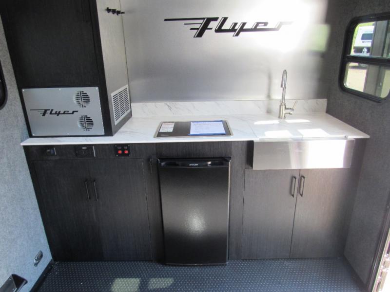 This Flyer expandable toy hauler is perfect for all your outdoor adventure! Not only does this toy hauler provide you with a spacious and versatile interior, but it also gives you a desirable cargo space so that you can bring along some toys for the adventure. This expandable comes standard with one tip-out bed, but you can easily add on the second optional tip-out bed which will add lots of extra room for sleeping and relaxing. The other feature found on this Flyer that is going to make your trips truly effortless is the front kitchen that comes with a two-burner stainless steel cooktop, a 3.1-cubic foot refrigerator, a large farmhouse sink, and an 8.5-gallon fresh water tank. This expandable toy hauler has a dry weight and net carrying capacity that ranges from 2,440-2,760 LBS.