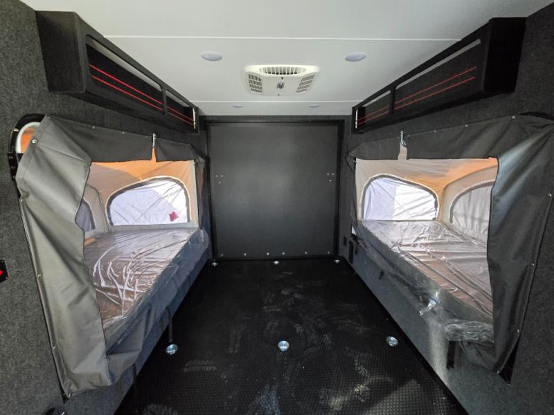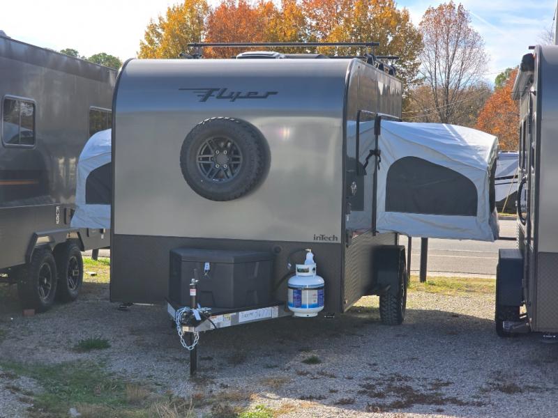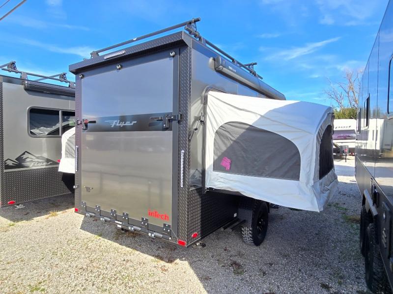 The inTech RV Flyer travel trailers and toy hauler expandables are ready for adventure whenever you are! With the all-aluminum, all-tube cage frame, the Flyer has been built with lightweight and long-lasting materials so that you can enjoy your unit for many, many years. The Flyer has a rugged design so that you can confidently explore new territory and go where traditional RVs cannot. The Flyer has a 2" rear receiver rated for 175 pounds which allows you to bring along your bikes, and the Bluetooth stereo has two speakers you can always have your best music playing. The optional roof rack will allow you to bring along kayaks, and there are more available options depending on the model you choose.