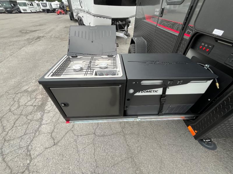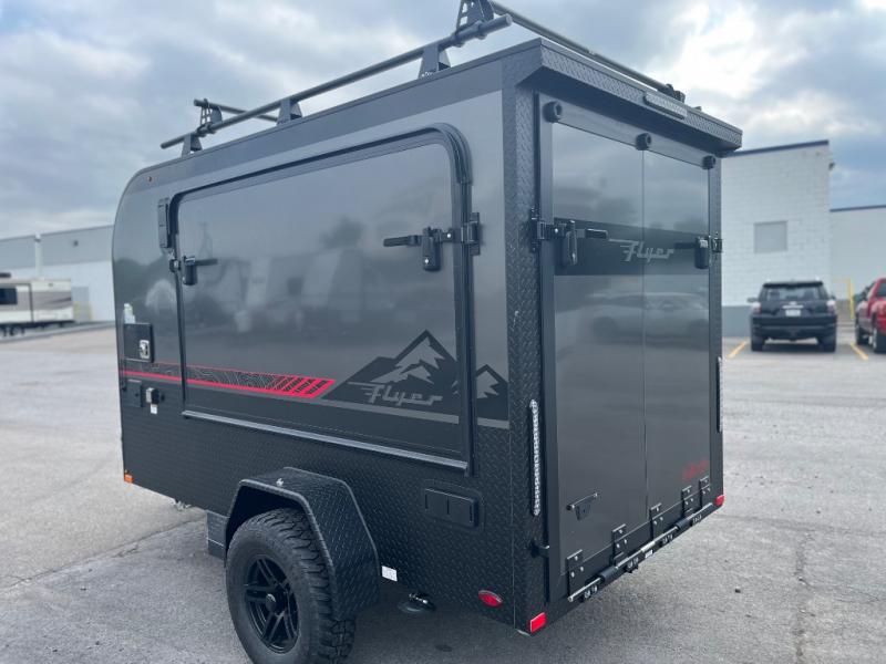 Not only is this Flyer toy hauler built to go where most traditional RVs cannot, but it is also built with a standard rear ramp or optional double rear doors, and six tie-down rings so that it can also serve as the perfect cargo transport too! The interior is spacious with its 46" x 81" tip-out bed, and if you add the second optional tip-out bed, you'll have an amazing amount of space on the inside. This expandable toy hauler is very functional, but you can make it even more enticing by adding optional Adventure Package that comes with an A/C, off-road tires, a roof rack, plus a slide out kitchen! This will allow you to cook wherever you choose to camp. The dry weight for this unit ranges from 1,580-2,110 LBS, the tongue weight ranges from 250-485 LBS, and the net carrying capacity ranges from 880-1,410 LBS.