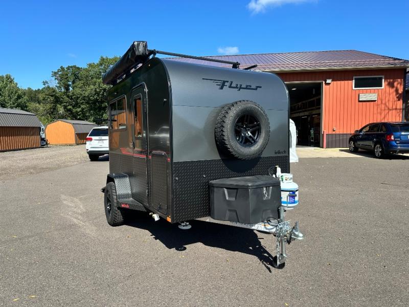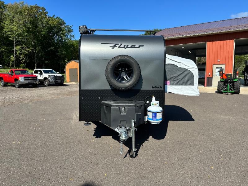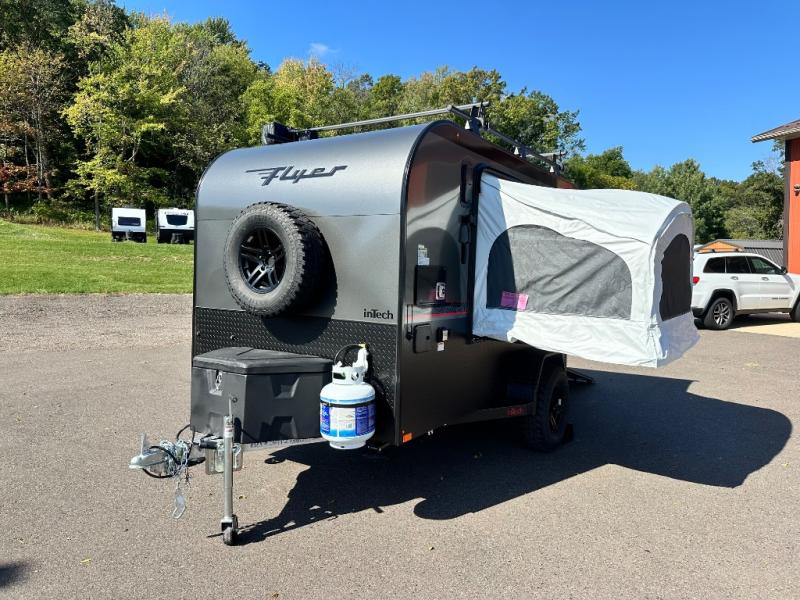 The inTech RV Flyer travel trailers and toy hauler expandables are ready for adventure whenever you are! With the all-aluminum, all-tube cage frame, the Flyer has been built with lightweight and long-lasting materials so that you can enjoy your unit for many, many years. The Flyer has a rugged design so that you can confidently explore new territory and go where traditional RVs cannot. The Flyer has a 2" rear receiver rated for 175 pounds which allows you to bring along your bikes, and the Bluetooth stereo has two speakers you can always have your best music playing. The optional roof rack will allow you to bring along kayaks, and there are more available options depending on the model you choose.