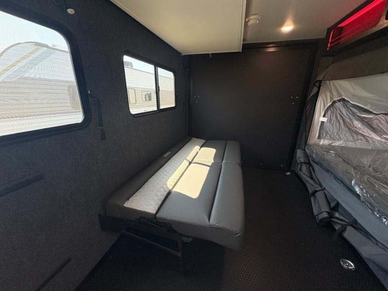 You asked for it and inTech RV delivered with this toy hauler expandable! You will enjoy some of the same features as the Discover model, but will also appreciate a wet bath in the Forge. There is a porcelain toilet, aluminum walls with a sealing exterior door so you don't need a shower curtain, storage space, and even a bath roof vent with an onboard switch! The kitchen includes everything you need to cook meals each day, including a two burner cooktop, a large farmhouse sink, and a spacious 8 cu.ft. 12V refrigerator! The 80" x 160" garage floor space features durable black coin flooring and is large enough to bring in most side-by-sides, plus there are tie-downs to keep your toys secure. For sleeping space, you'll find a tip-out bed and a standard sleeper sofa, and if you have more campers tagging along, you can add the optional drop-down bunk, or even bring your own air mattress! A few more stand-out features you'll love on the Forge are the on-demand LP water heater, the aluminum walk-on roof, tinted windows, and Airline Track sidewall tie-down area! The dry weight for this model ranges from 3,845 lbs. - 4,300 lbs., and the carrying capacity ranges from 2,700 lbs. - 3,155 lbs.