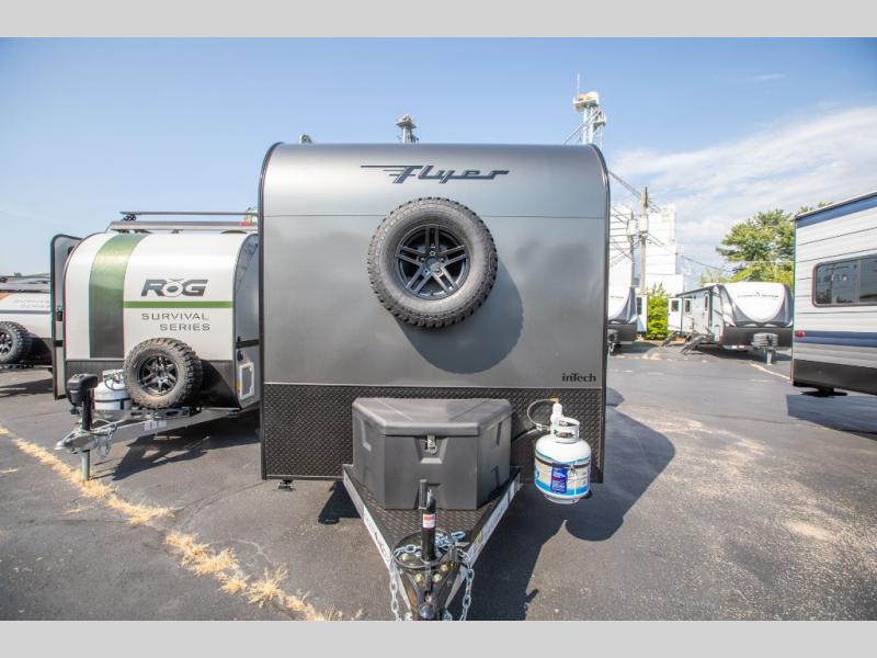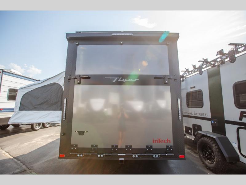 The inTech RV Flyer travel trailers and toy hauler expandables are ready for adventure whenever you are! With the all-aluminum, all-tube cage frame, the Flyer has been built with lightweight and long-lasting materials so that you can enjoy your unit for many, many years. The Flyer has a rugged design so that you can confidently explore new territory and go where traditional RVs cannot. The Flyer has a 2" rear receiver rated for 175 pounds which allows you to bring along your bikes, and the Bluetooth stereo has two speakers you can always have your best music playing. The optional roof rack will allow you to bring along kayaks, and there are more available options depending on the model you choose.