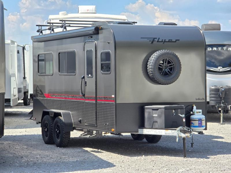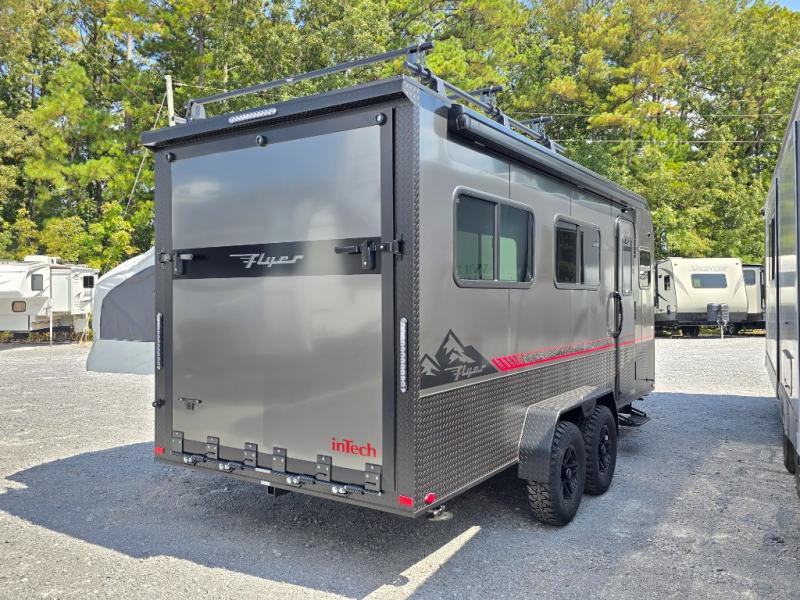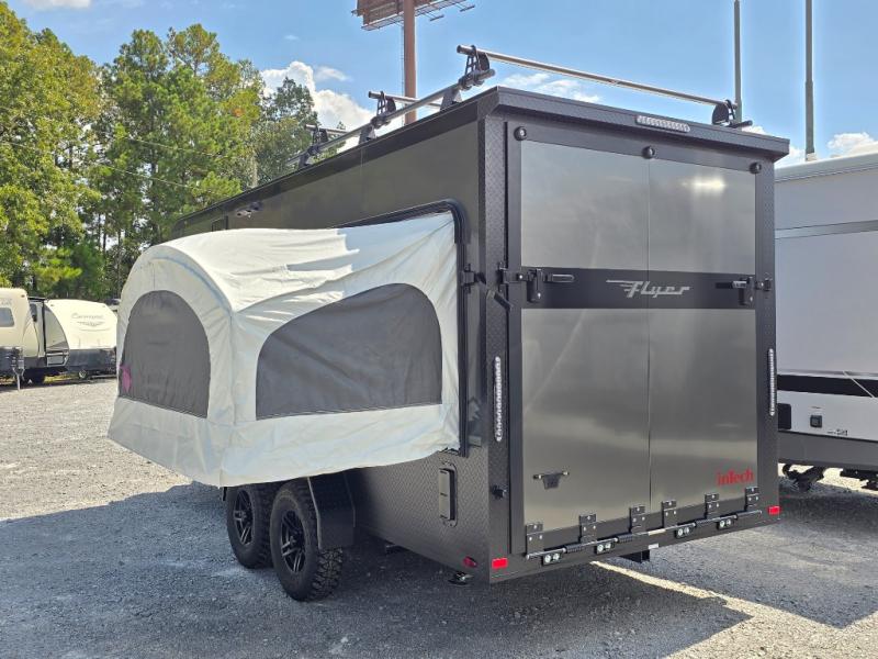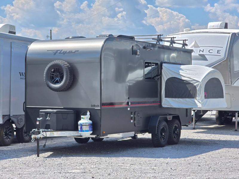 The inTech RV Flyer travel trailers and toy hauler expandables are ready for adventure whenever you are! With the all-aluminum, all-tube cage frame, the Flyer has been built with lightweight and long-lasting materials so that you can enjoy your unit for many, many years. The Flyer has a rugged design so that you can confidently explore new territory and go where traditional RVs cannot. The Flyer has a 2" rear receiver rated for 175 pounds which allows you to bring along your bikes, and the Bluetooth stereo has two speakers you can always have your best music playing. The optional roof rack will allow you to bring along kayaks, and there are more available options depending on the model you choose.