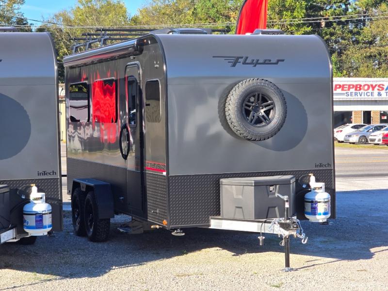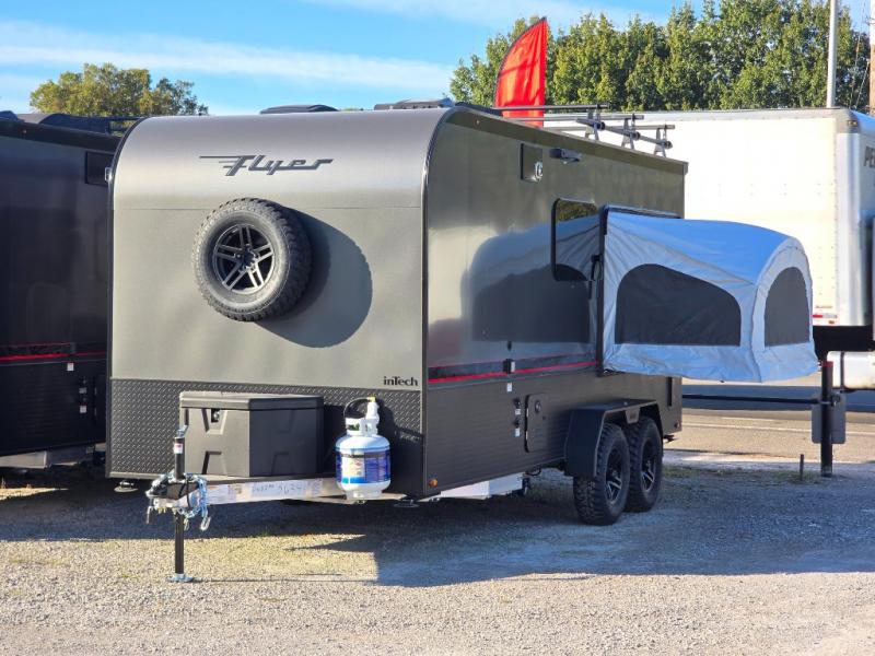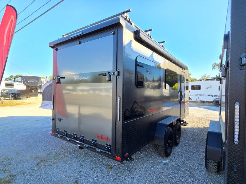 The inTech RV Flyer travel trailers and toy hauler expandables are ready for adventure whenever you are! With the all-aluminum, all-tube cage frame, the Flyer has been built with lightweight and long-lasting materials so that you can enjoy your unit for many, many years. The Flyer has a rugged design so that you can confidently explore new territory and go where traditional RVs cannot. The Flyer has a 2" rear receiver rated for 175 pounds which allows you to bring along your bikes, and the Bluetooth stereo has two speakers you can always have your best music playing. The optional roof rack will allow you to bring along kayaks, and there are more available options depending on the model you choose.