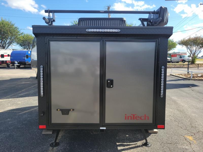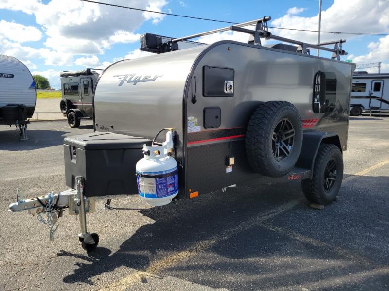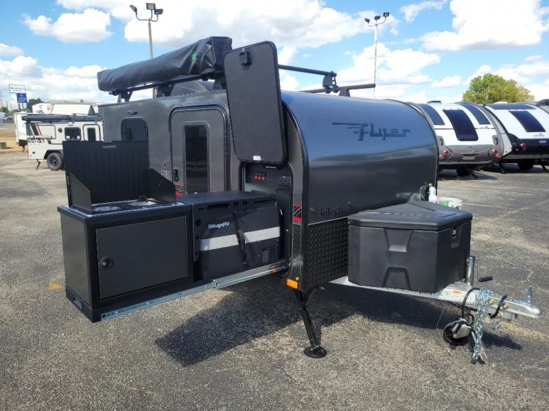 The inTech RV Flyer travel trailers and toy hauler expandables are ready for adventure whenever you are! With the all-aluminum, all-tube cage frame, the Flyer has been built with lightweight and long-lasting materials so that you can enjoy your unit for many, many years. The Flyer has a rugged design so that you can confidently explore new territory and go where traditional RVs cannot. The Flyer has a 2" rear receiver rated for 175 pounds which allows you to bring along your bikes, and the Bluetooth stereo has two speakers you can always have your best music playing. The optional roof rack will allow you to bring along kayaks, and there are more available options depending on the model you choose.