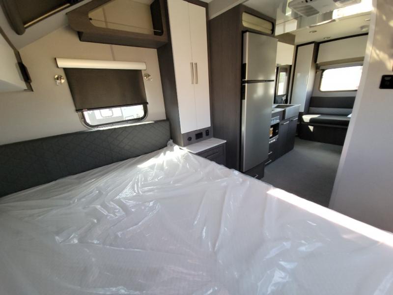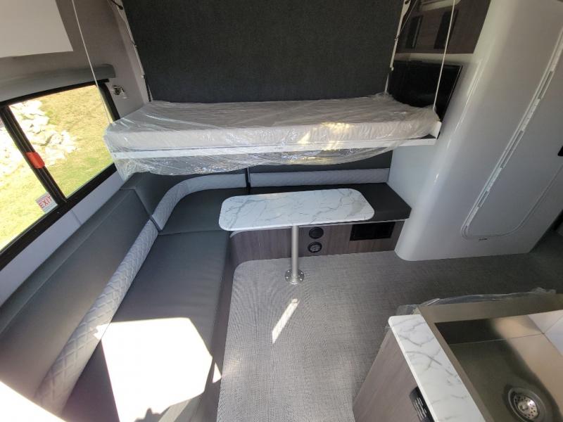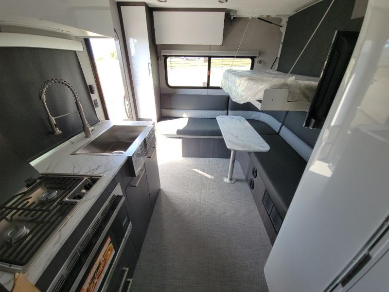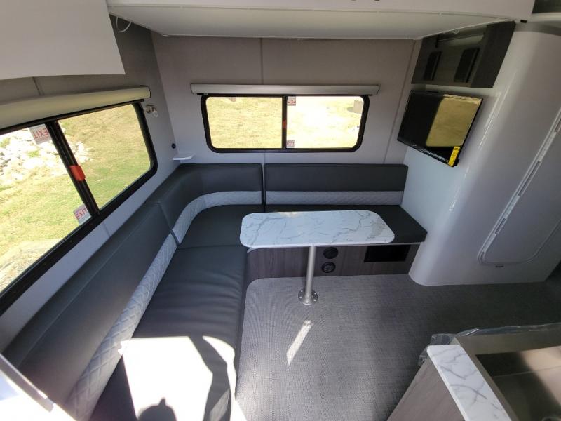 Plan to see it all in this rugged travel trailer that can sleep four with the front queen and the L-shaped dinette. And you can choose to add the optional drop-down bunk or optional twin beds in place of the queen bed up front! The wet bath allows you to easily freshen up each day, and the chef of your group will love this O-V-R kitchen. Here, you'll find a two burner stainless steel cooktop, a convection microwave, plus a 10 cu. ft. 12V refrigerator for perishables. This model also includes plenty of storage spaces, including four exterior storage compartments, five cubbies, plus a pantry cabinet just for snacks. You may want to add the optional slide out exterior kitchen and optional exterior refrigerator for the cook who loves making breakfast outdoors, or add the optional 3.6kW LP generator that will pair great with the optional Off-Grid Package!