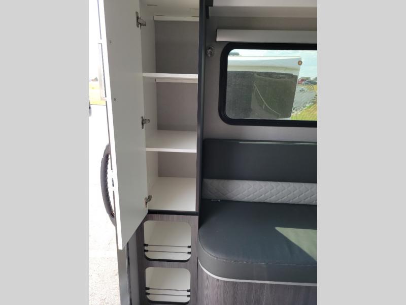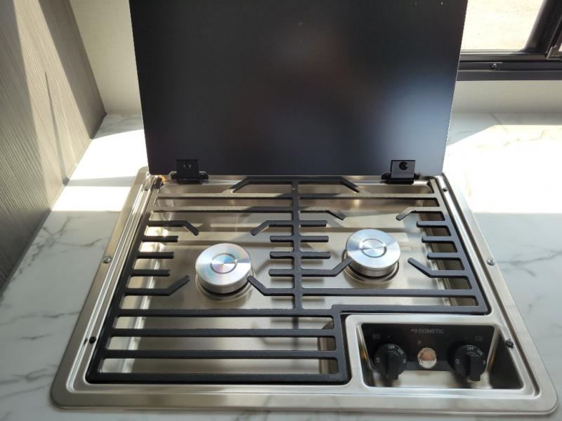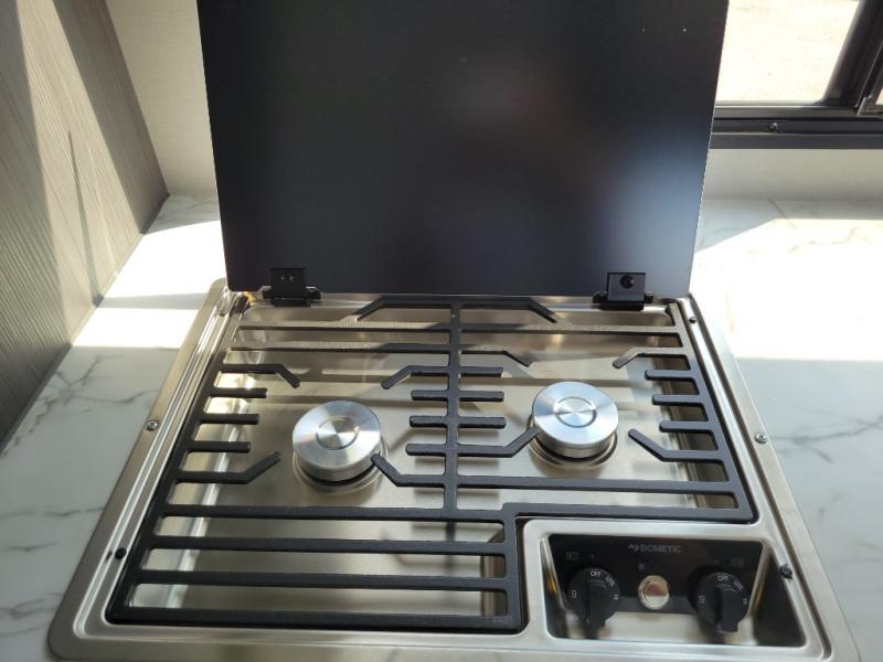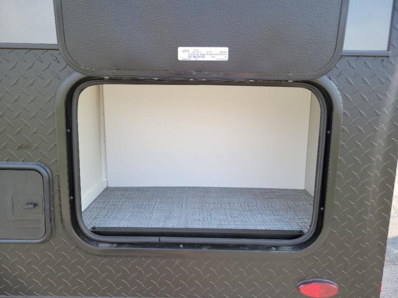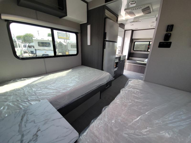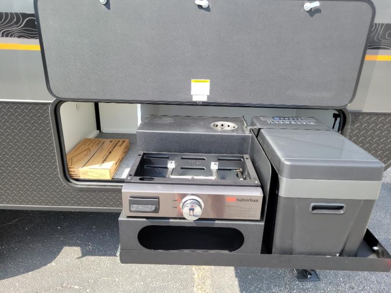 Plan to see it all in this rugged travel trailer that can sleep four with the front queen and the L-shaped dinette. And you can choose to add the optional drop-down bunk or optional twin beds in place of the queen bed up front! The wet bath allows you to easily freshen up each day, and the chef of your group will love this O-V-R kitchen. Here, you'll find a two burner stainless steel cooktop, a convection microwave, plus a 10 cu. ft. 12V refrigerator for perishables. This model also includes plenty of storage spaces, including four exterior storage compartments, five cubbies, plus a pantry cabinet just for snacks. You may want to add the optional slide out exterior kitchen and optional exterior refrigerator for the cook who loves making breakfast outdoors, or add the optional 3.6kW LP generator that will pair great with the optional Off-Grid Package!