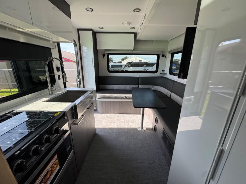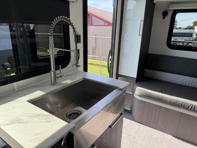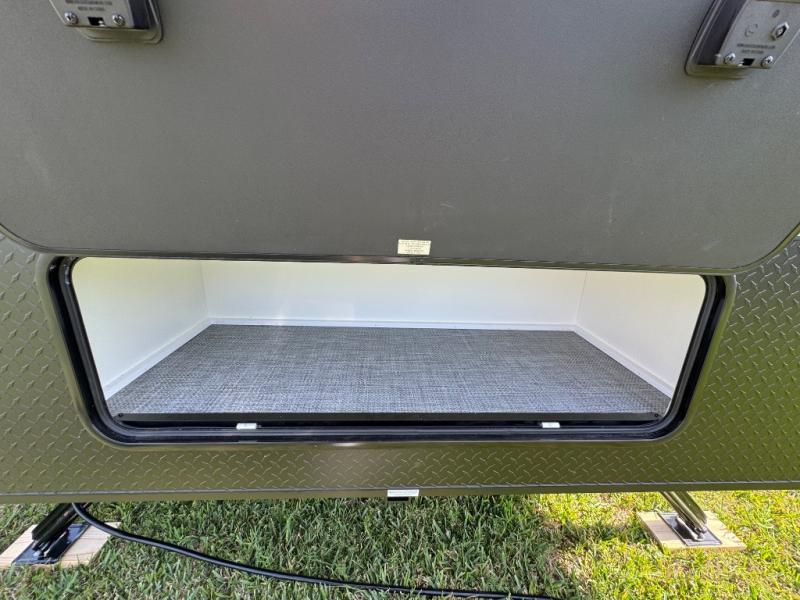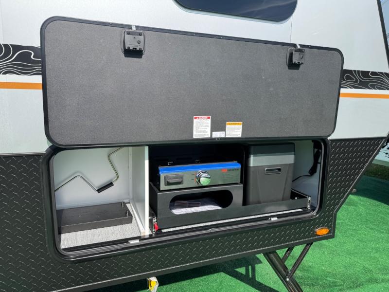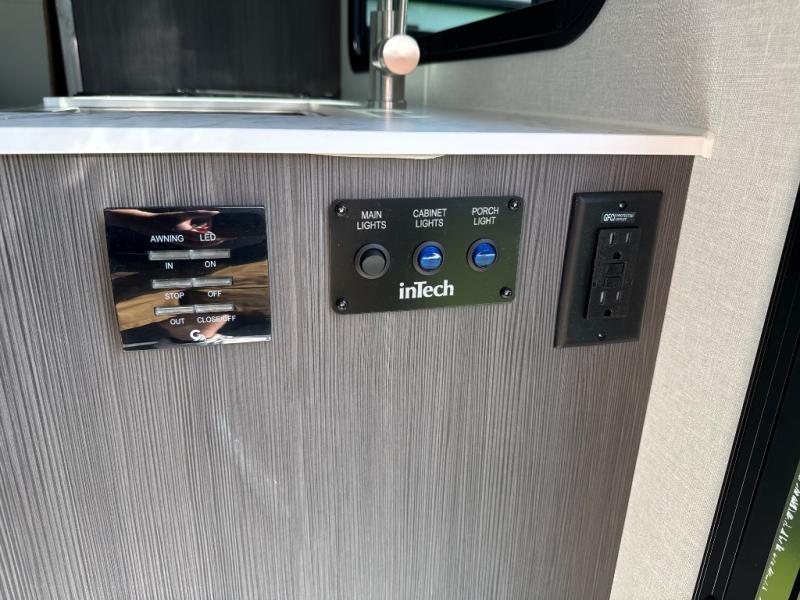 The O-R-V travel trailers and toy hauler by inTech RV allow you to experience adventure off the beaten path with its rugged exterior and lightweight construction provided by the all-aluminum fully welded cage frame. The power tongue jack will make setting up camp a breeze, plus there is a fold-away double entry step and exterior lighting for added convenience. Inside, you'll find a large farmhouse style sink, a MaxxAir vent for ventilation, plus infinity woven flooring. There is a Bluetooth stereo with four speakers and a 32" Smart TV included with each model, plus USB and 110V outlets to keep your electronics charged and ready to go. Further customize your O-V-R by adding the optional power awning or the optional Off-Grid Package with 400 watts of solar power, 20 amp hours of lithium batteries, and a 2,000 watt inverter!