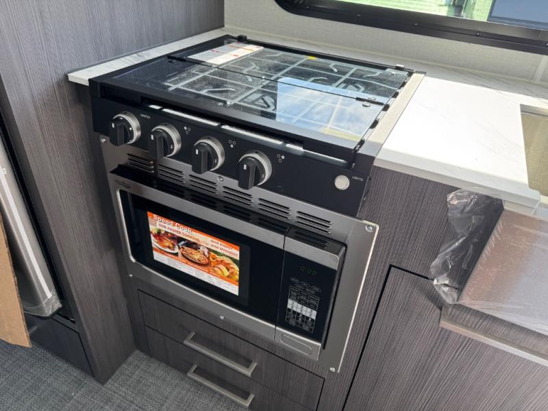 Plan to see it all in this rugged travel trailer that can sleep four with the front queen and the L-shaped dinette. And you can choose to add the optional drop-down bunk or optional twin beds in place of the queen bed up front! The wet bath allows you to easily freshen up each day, and the chef of your group will love this O-V-R kitchen. Here, you'll find a two burner stainless steel cooktop, a convection microwave, plus a 10 cu. ft. 12V refrigerator for perishables. This model also includes plenty of storage spaces, including four exterior storage compartments, five cubbies, plus a pantry cabinet just for snacks. You may want to add the optional slide out exterior kitchen and optional exterior refrigerator for the cook who loves making breakfast outdoors, or add the optional 3.6kW LP generator that will pair great with the optional Off-Grid Package!