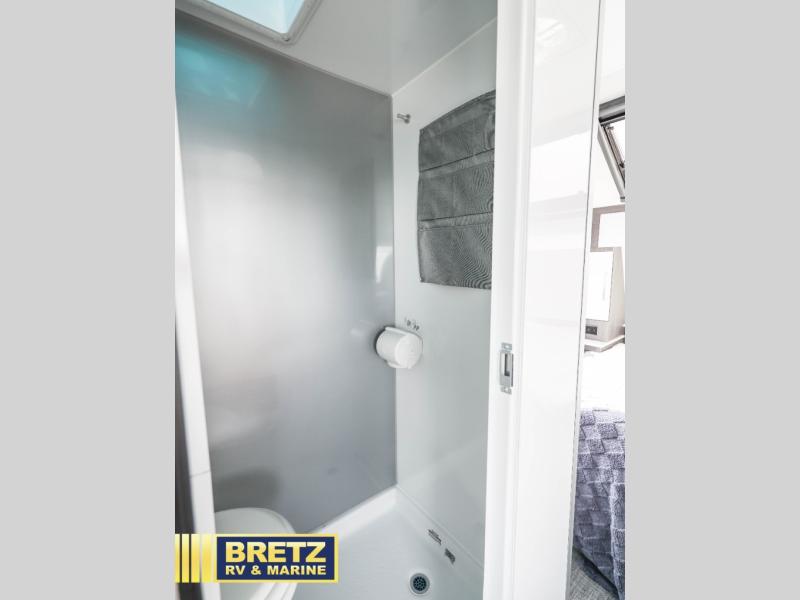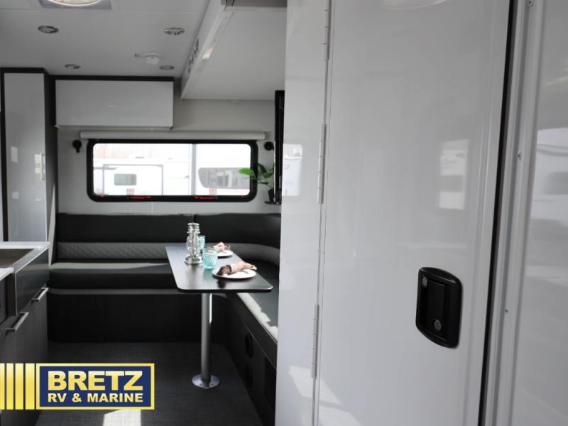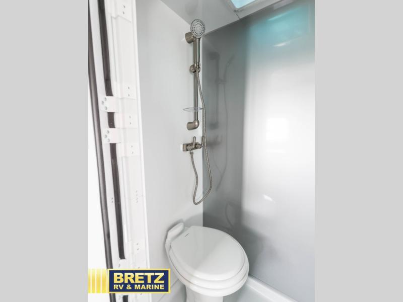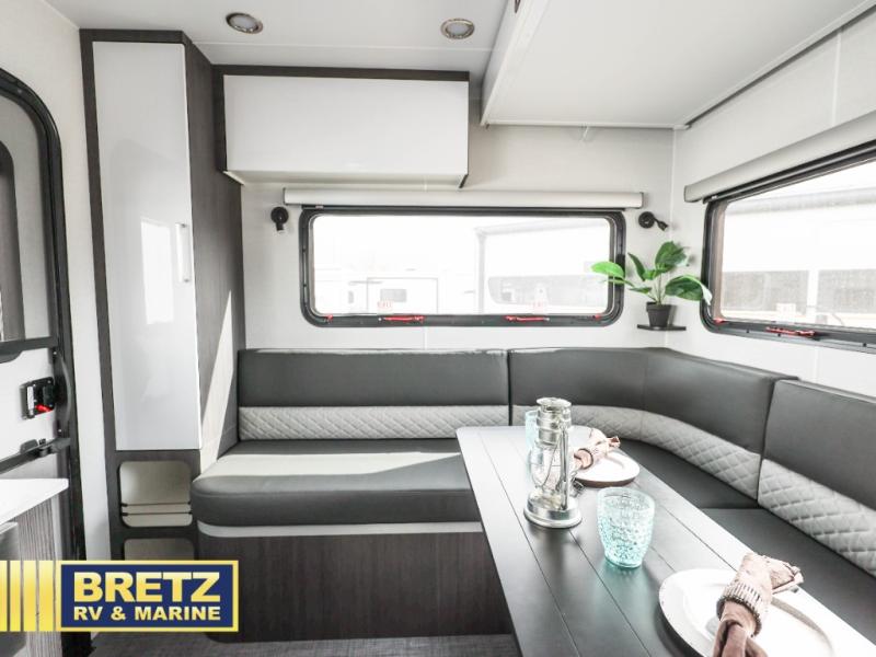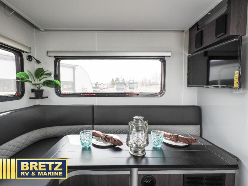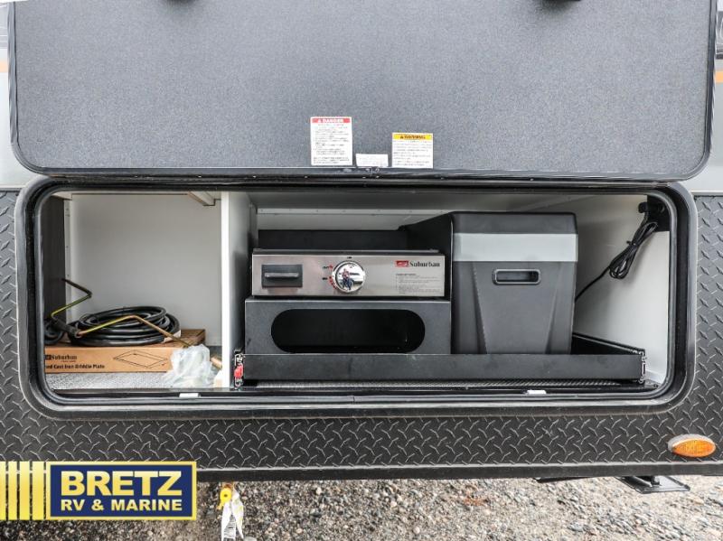 Plan to see it all in this rugged travel trailer that can sleep four with the front queen and the L-shaped dinette. And you can choose to add the optional drop-down bunk or optional twin beds in place of the queen bed up front! The wet bath allows you to easily freshen up each day, and the chef of your group will love this O-V-R kitchen. Here, you'll find a two burner stainless steel cooktop, a convection microwave, plus a 10 cu. ft. 12V refrigerator for perishables. This model also includes plenty of storage spaces, including four exterior storage compartments, five cubbies, plus a pantry cabinet just for snacks. You may want to add the optional slide out exterior kitchen and optional exterior refrigerator for the cook who loves making breakfast outdoors, or add the optional 3.6kW LP generator that will pair great with the optional Off-Grid Package!