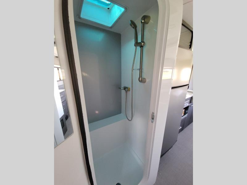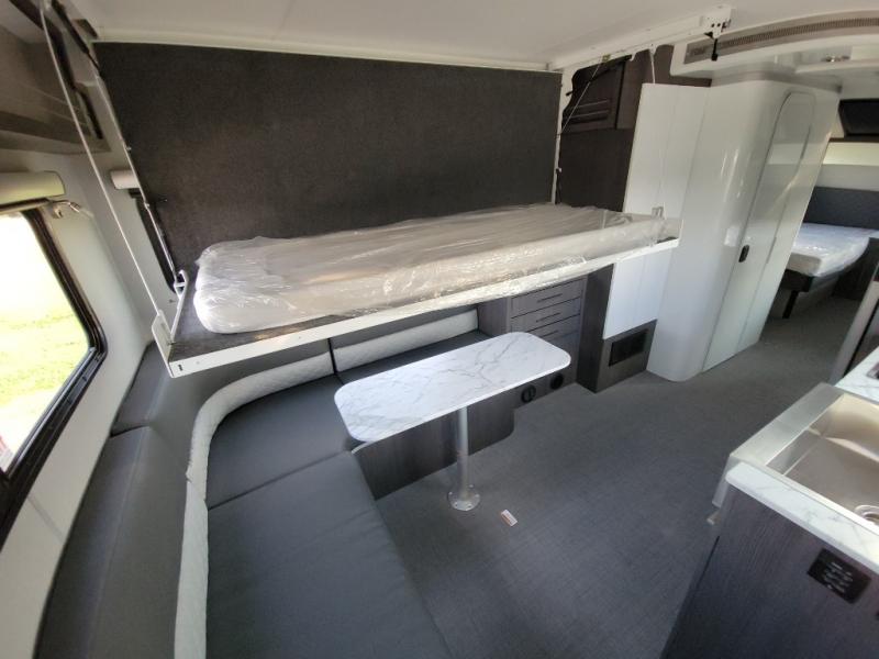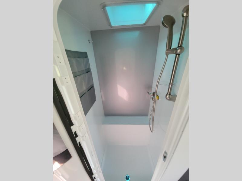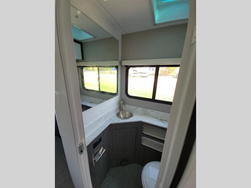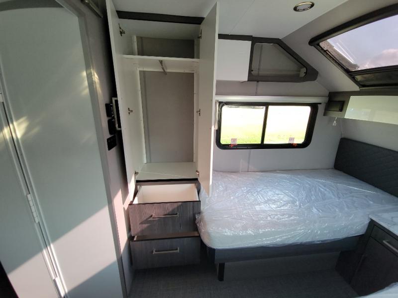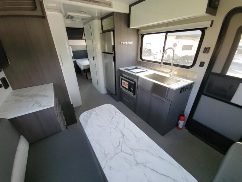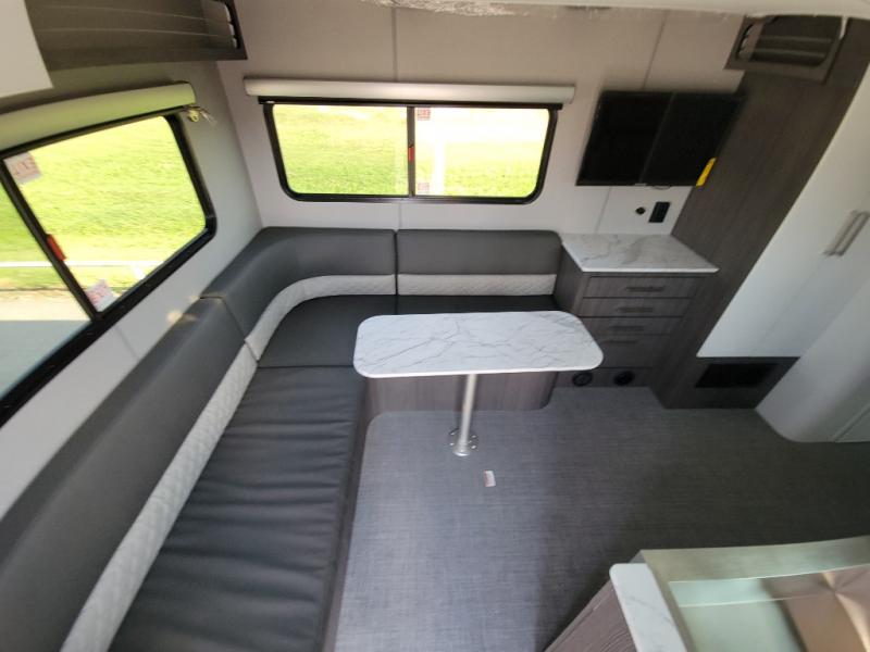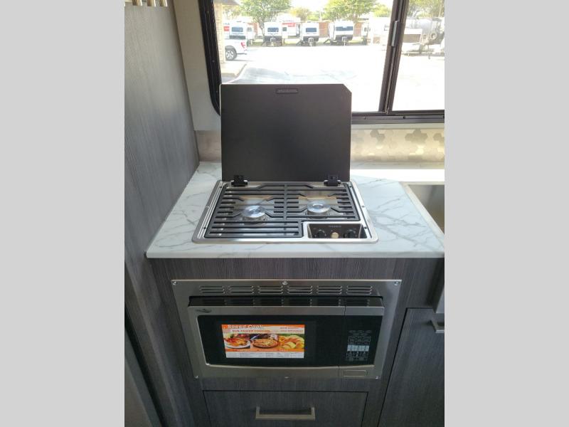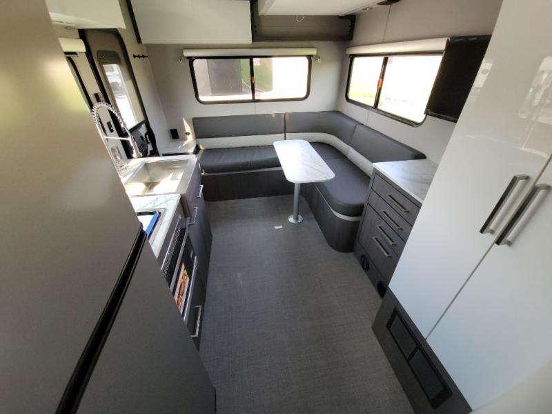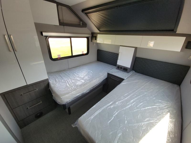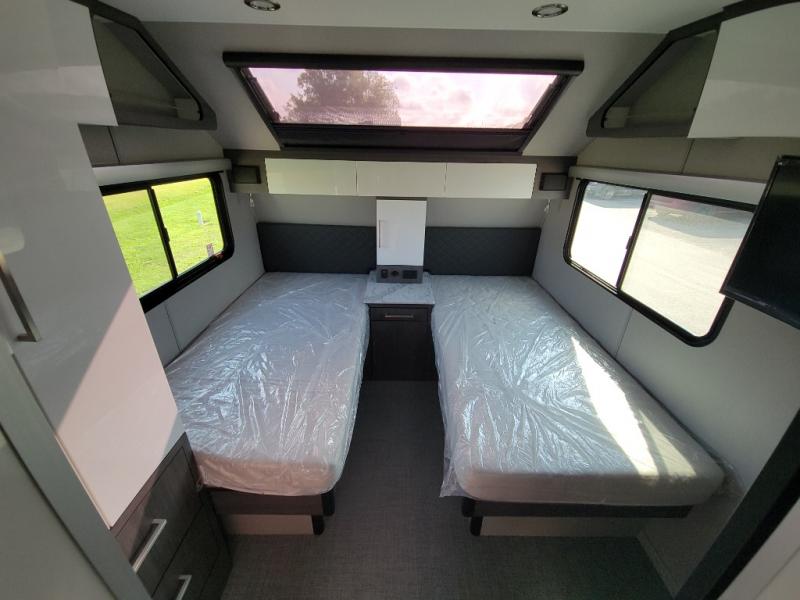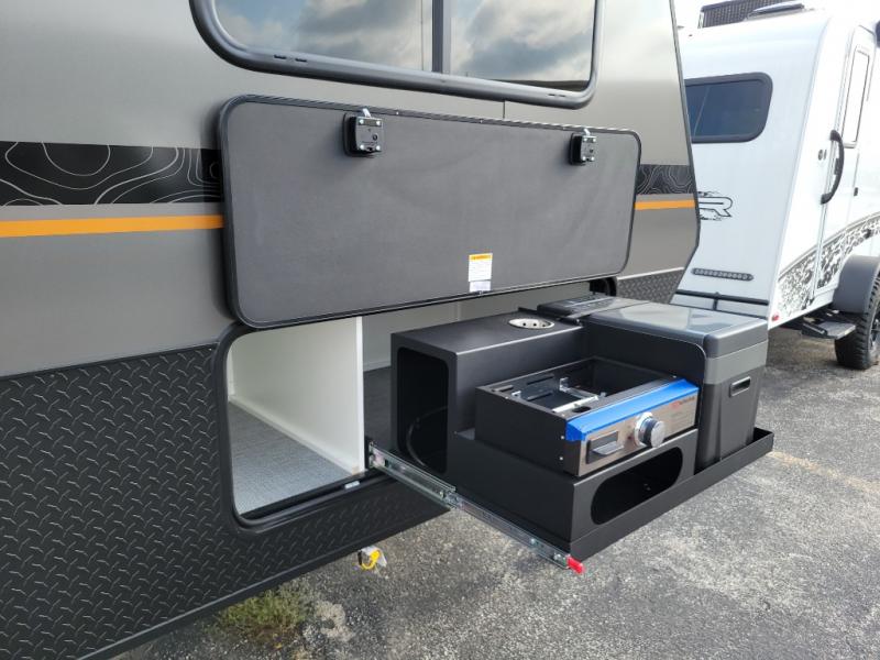 Navigate tough roads in this O-V-R travel trailer! You will love having your own walk-around queen bed in the front bedroom, or you can choose the optional twin beds in place of the queen bed. There is a private porcelain toilet and a round sink across the hall from the shower, allowing two people to freshen up at once, and you'll appreciate the base cabinet with under-sink storage for your toiletries. Once you've worked up an appetite from hiking, head to the kitchen to prepare lunch on the stainless steel two burner cooktop and grab a cold drink from the 10 cu. ft. 12V refrigerator. You can dine at the L-shaped dinette, or head outdoors to relax in your camp chair. Add the optional slide out exterior kitchen or the optional 3.6kW LP generator for even more convenience!