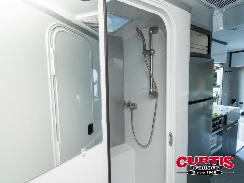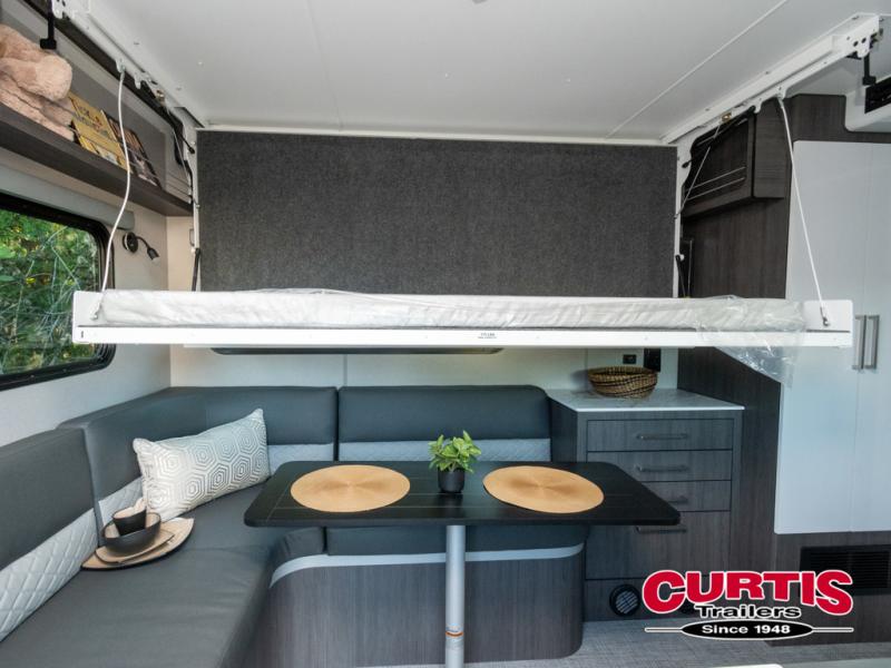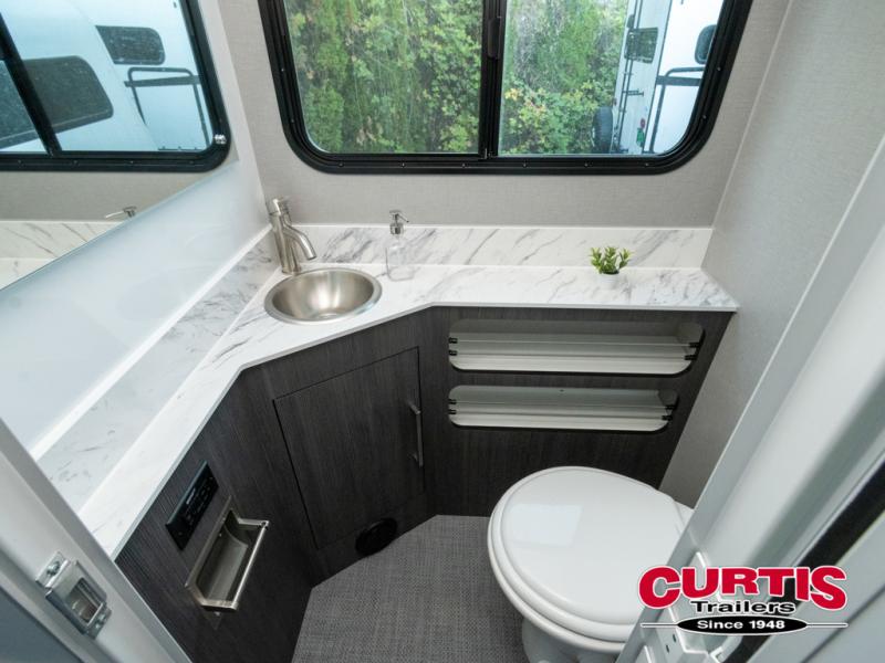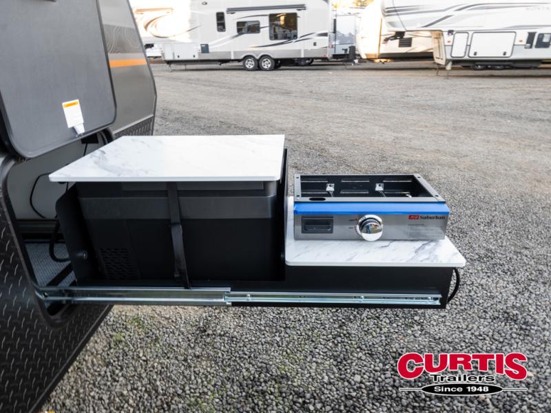 Navigate tough roads in this O-V-R travel trailer! You will love having your own walk-around queen bed in the front bedroom, or you can choose the optional twin beds in place of the queen bed. There is a private porcelain toilet and a round sink across the hall from the shower, allowing two people to freshen up at once, and you'll appreciate the base cabinet with under-sink storage for your toiletries. Once you've worked up an appetite from hiking, head to the kitchen to prepare lunch on the stainless steel two burner cooktop and grab a cold drink from the 10 cu. ft. 12V refrigerator. You can dine at the L-shaped dinette, or head outdoors to relax in your camp chair. Add the optional slide out exterior kitchen or the optional 3.6kW LP generator for even more convenience!