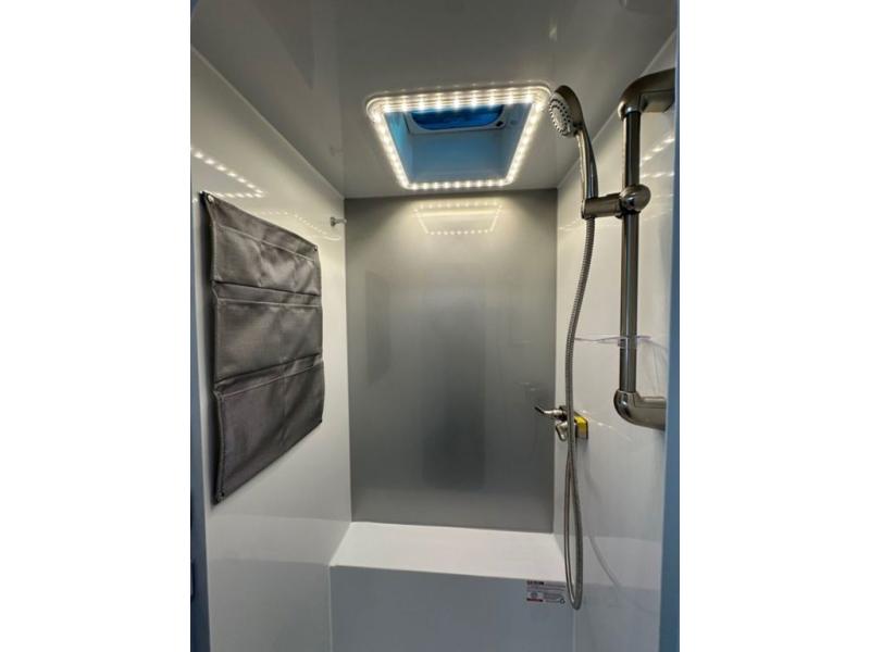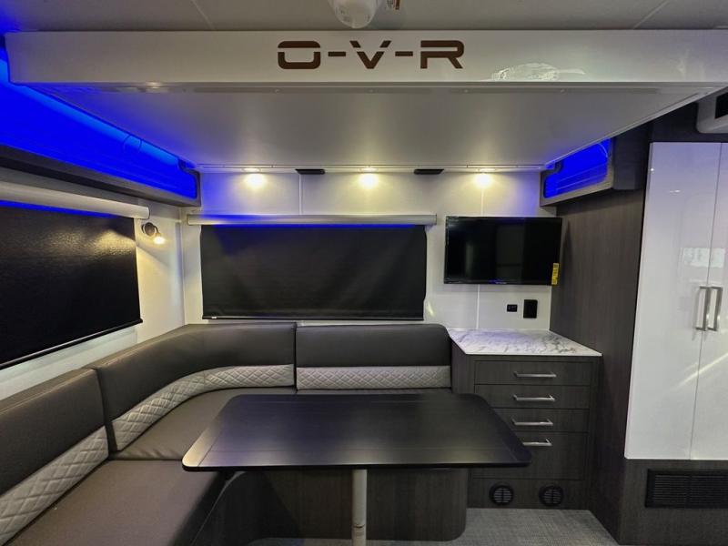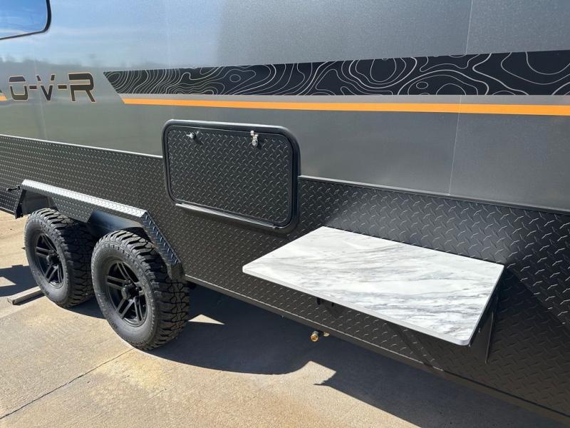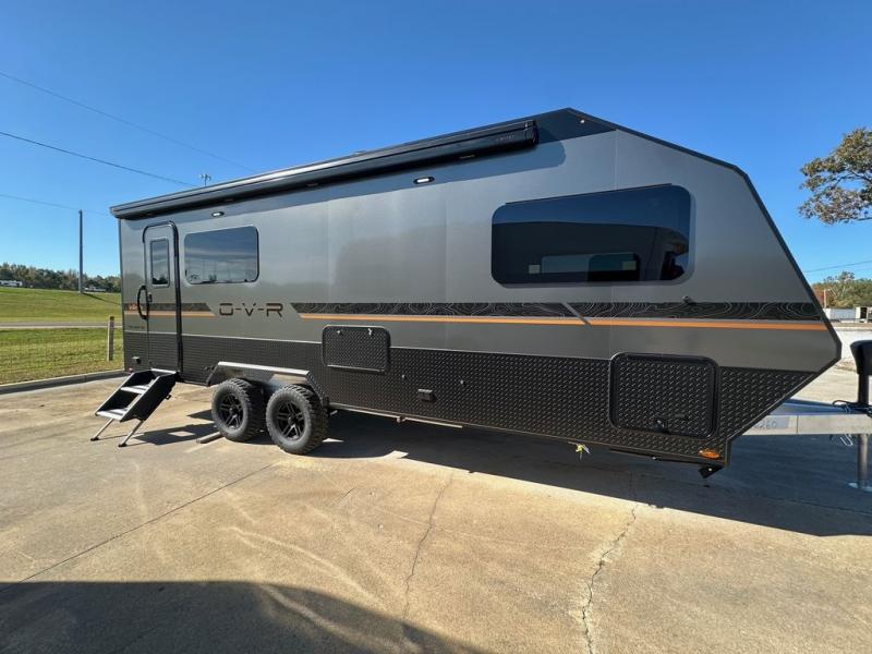 Navigate tough roads in this O-V-R travel trailer! You will love having your own walk-around queen bed in the front bedroom, or you can choose the optional twin beds in place of the queen bed. There is a private porcelain toilet and a round sink across the hall from the shower, allowing two people to freshen up at once, and you'll appreciate the base cabinet with under-sink storage for your toiletries. Once you've worked up an appetite from hiking, head to the kitchen to prepare lunch on the stainless steel two burner cooktop and grab a cold drink from the 10 cu. ft. 12V refrigerator. You can dine at the L-shaped dinette, or head outdoors to relax in your camp chair. Add the optional slide out exterior kitchen or the optional 3.6kW LP generator for even more convenience!