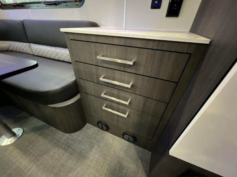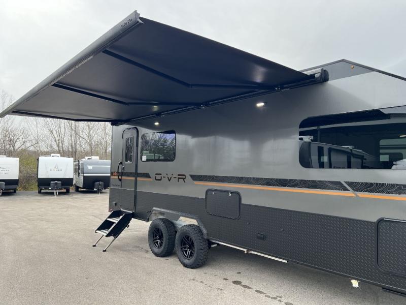 Navigate tough roads in this O-V-R travel trailer! You will love having your own walk-around queen bed in the front bedroom, or you can choose the optional twin beds in place of the queen bed. There is a private porcelain toilet and a round sink across the hall from the shower, allowing two people to freshen up at once, and you'll appreciate the base cabinet with under-sink storage for your toiletries. Once you've worked up an appetite from hiking, head to the kitchen to prepare lunch on the stainless steel two burner cooktop and grab a cold drink from the 10 cu. ft. 12V refrigerator. You can dine at the L-shaped dinette, or head outdoors to relax in your camp chair. Add the optional slide out exterior kitchen or the optional 3.6kW LP generator for even more convenience!