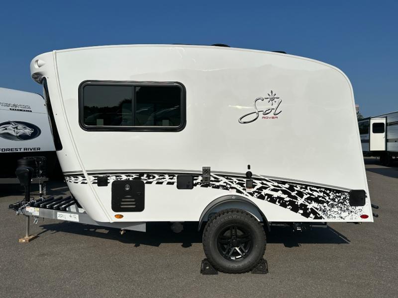 Make each adventure count with this Sol travel trailer. You and your loved one will have a convertible dinette to enjoy meals at and sleep on at night. In the morning, prepare eggs and bacon on the two burner stainless steel cooktop before heading out for the day. If you've chosen the optional 7' awning, you may not wander off too far from your trailer. This model also includes a wet bath with a porcelain toilet, a roof vent, plus a mesh shower storage net with two towel hooks for your convenience. This model also has a dry weight that ranges from 2,682-2,952 lbs., a tongue weight between 280-310 lbs., and a carrying capacity between 805-910 lbs. When the optional Rover Package is chosen on this model, you'll enjoy rugged decals, a 3" lift, blackout wheels, and more; see dealer for more details!