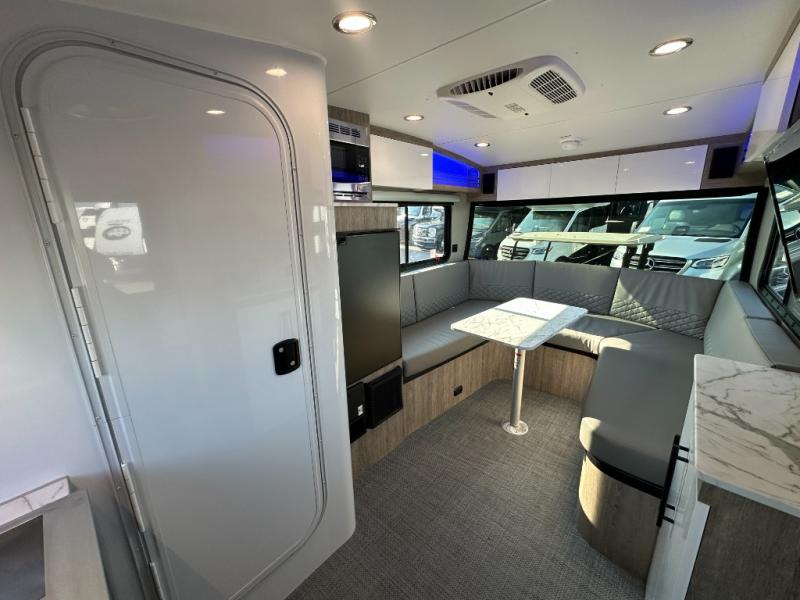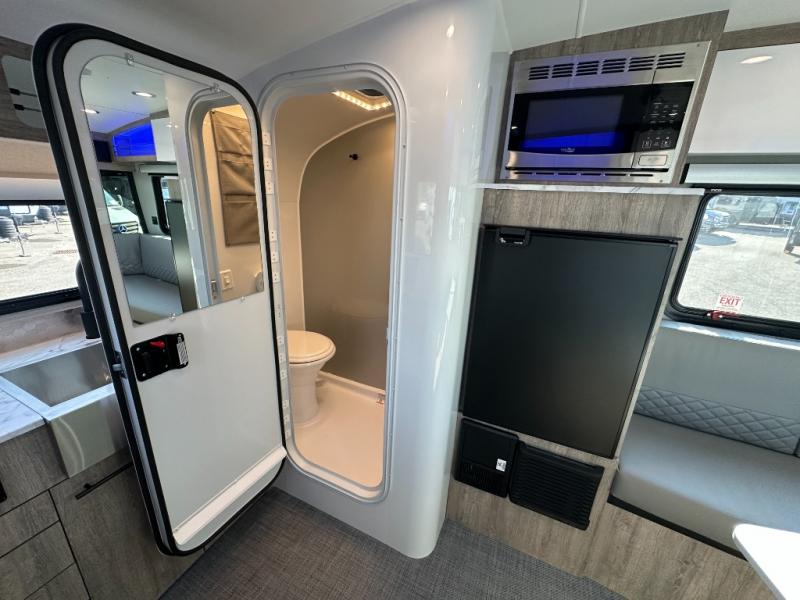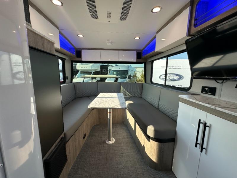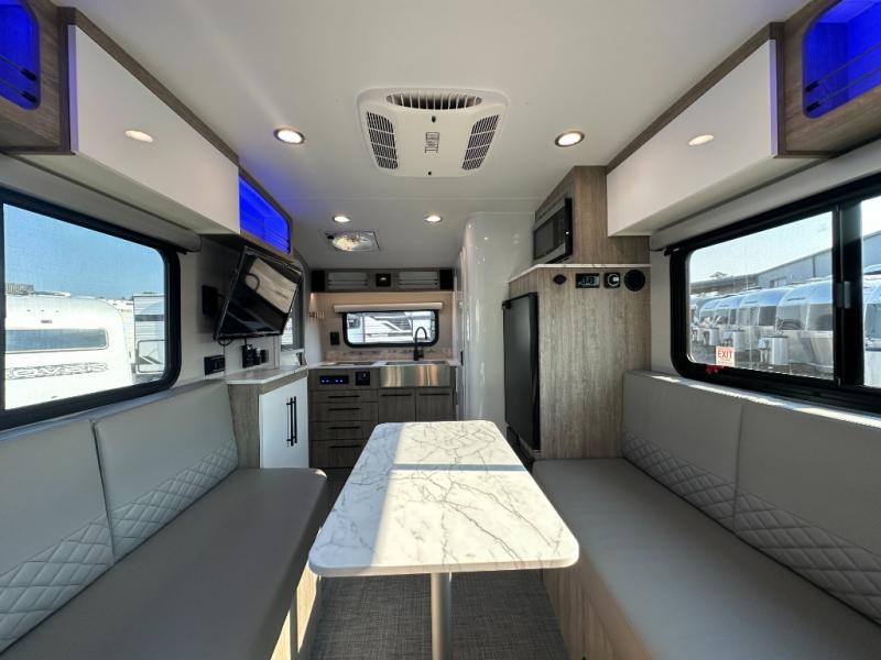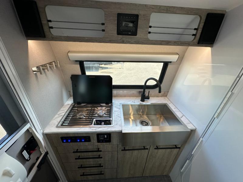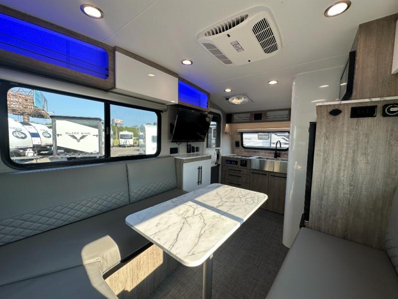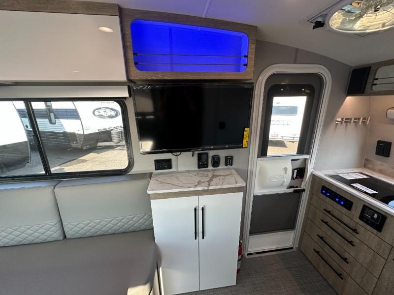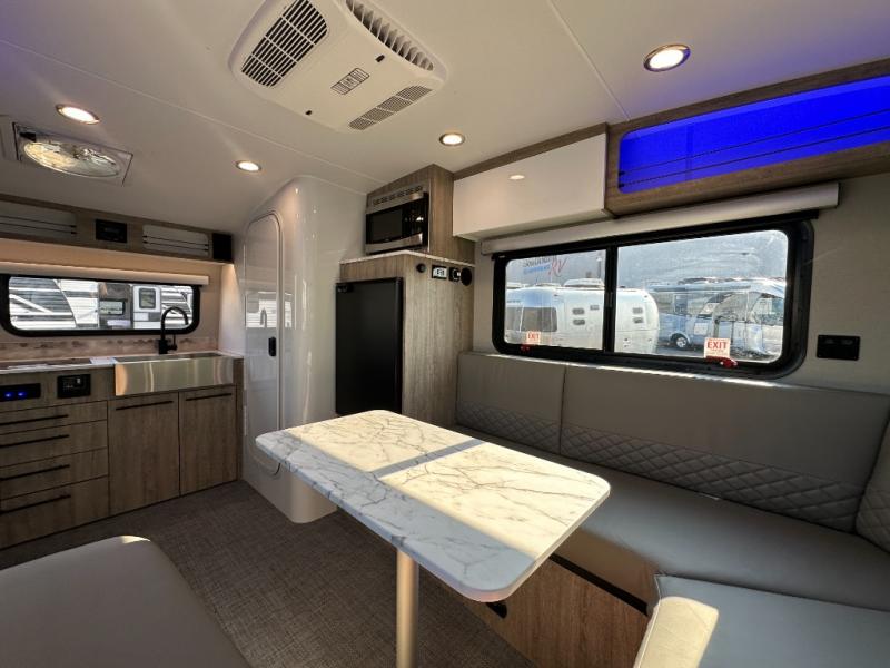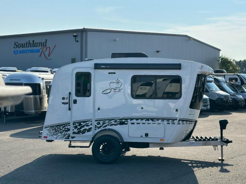 With any Sol travel trailer by inTech RV you will find strong, durable construction consisting of lightweight aluminum that is easier to tow and resists rust, water, and dents. The Tilt-Forward Design creates more space inside so you can stretch out, and the panoramic windshield gives a great view of the mountains, ocean, or forest! The elegant interior features tinted windows with shades, Infinity woven flooring, and a stainless steel cooktop and microwave. You will stay comfortable year around since these models include a 15K BTU A/C and a 16K BTU furnace.
