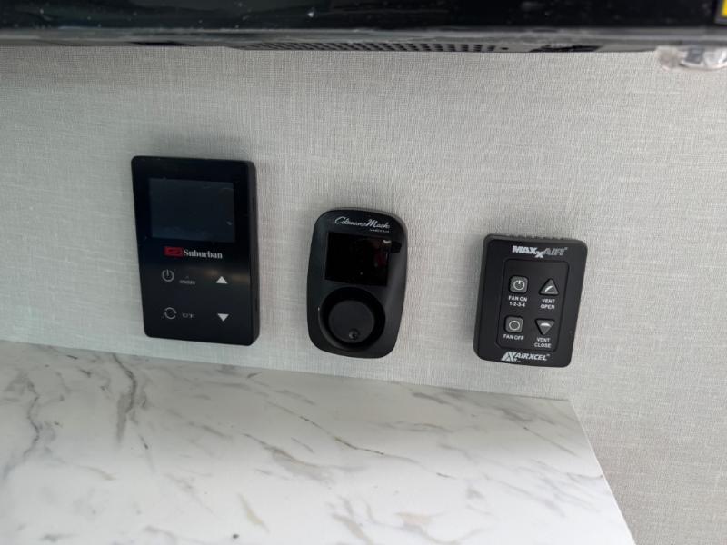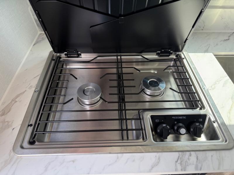 Make each adventure count with this Sol travel trailer. You and your loved one will have a convertible dinette to enjoy meals at and sleep on at night. In the morning, prepare eggs and bacon on the two burner stainless steel cooktop before heading out for the day. If you've chosen the optional 7' awning, you may not wander off too far from your trailer. This model also includes a wet bath with a porcelain toilet, a roof vent, plus a mesh shower storage net with two towel hooks for your convenience. This model also has a dry weight that ranges from 2,650-2,731 lbs., a tongue weight between 280-310 lbs., and a carrying capacity between 805-910 lbs.