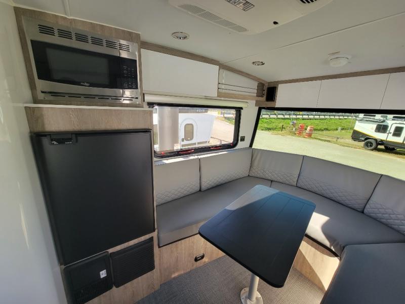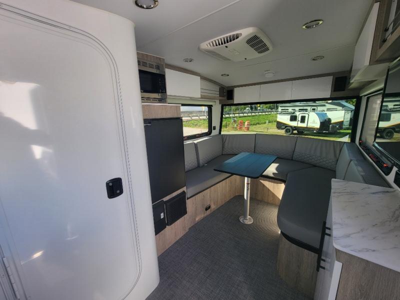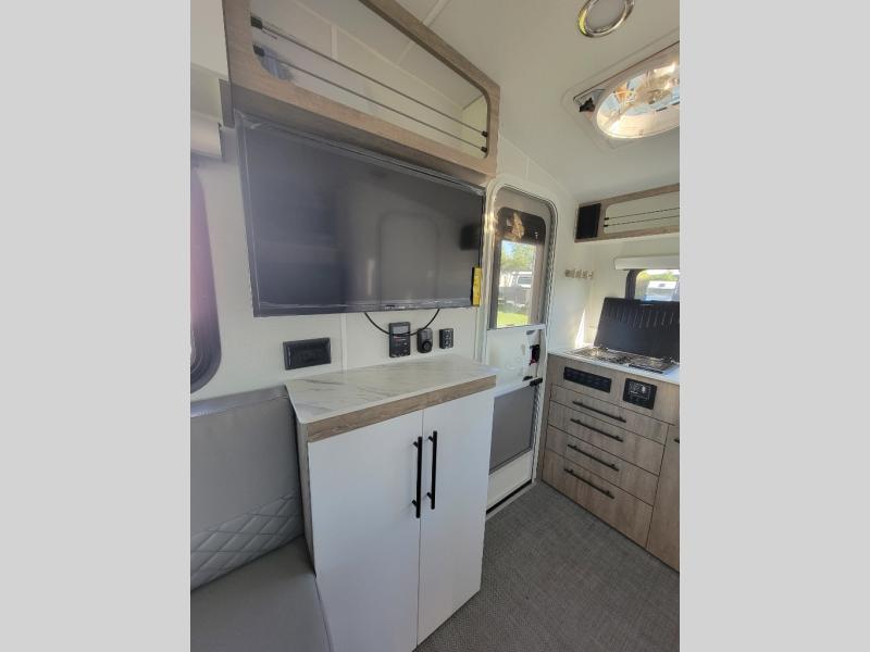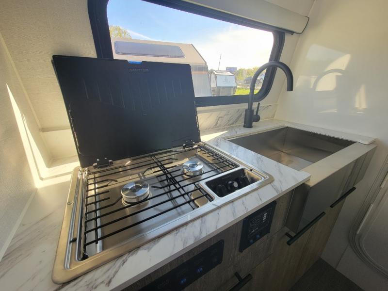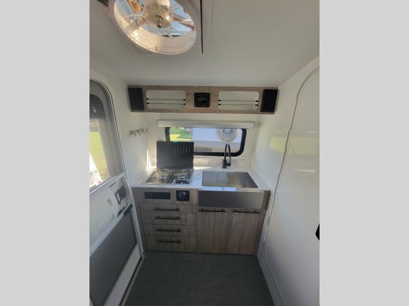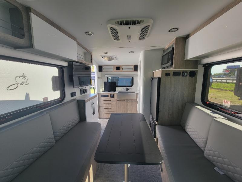 With any Sol travel trailer by inTech RV you will find strong, durable construction consisting of lightweight aluminum that is easier to tow and resists rust, water, and dents. The Tilt-Forward Design creates more space inside so you can stretch out, and the panoramic windshield gives a great view of the mountains, ocean, or forest! The elegant interior features tinted windows with shades, Infinity woven flooring, and a stainless steel cooktop and microwave. You will stay comfortable year around since these models include a 15K BTU A/C and a 16K BTU furnace.